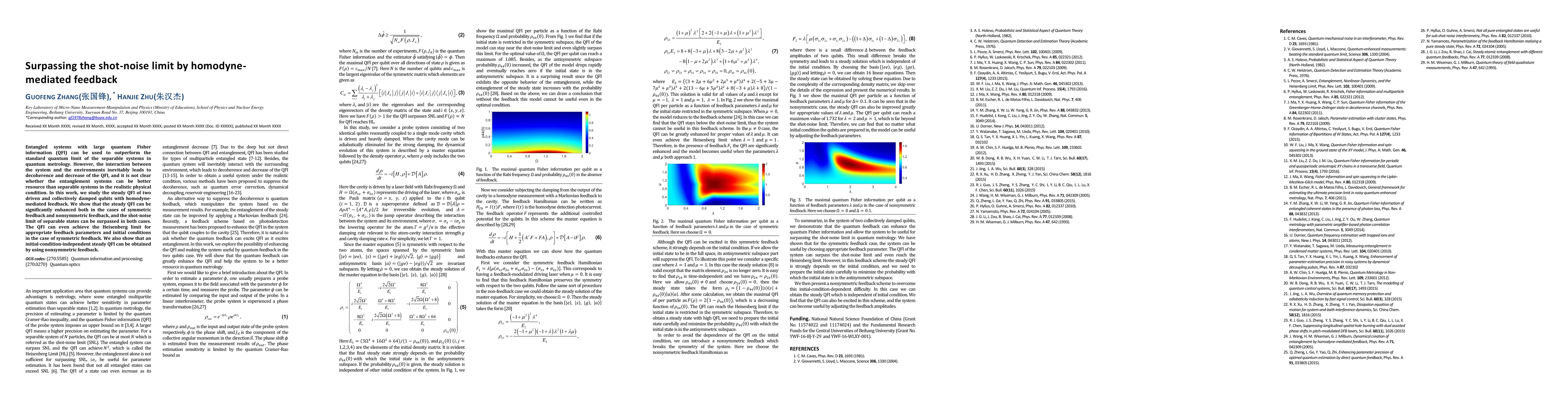 This paper demonstrates that homodyne-mediated feedback can significantly enhance the quantum Fisher information (QFI) of entangled qubits, surpassing the shot-noise limit and potentially achieving the Heisenberg limit under symmetric feedback, while nonsymmetric feedback provides an initial-condition-independent steady QFI.