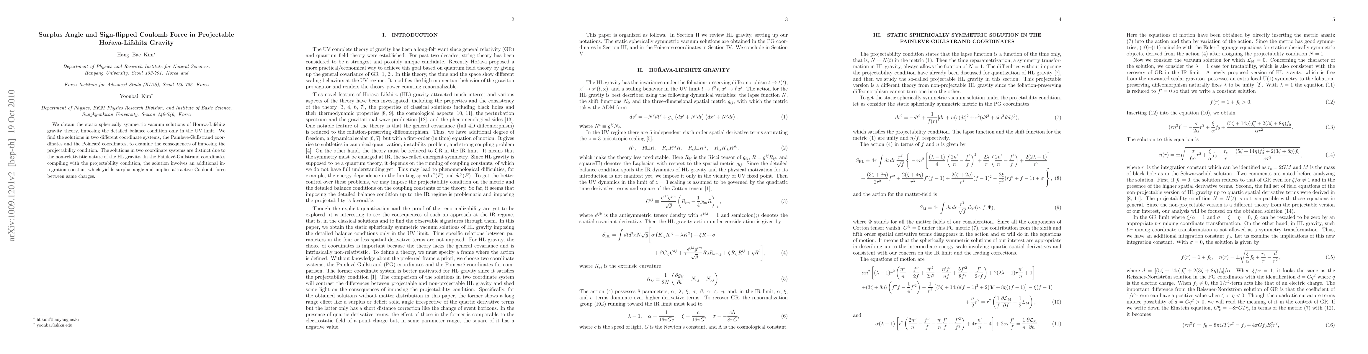 This paper investigates static spherically symmetric vacuum solutions in Horava-Lifshitz gravity under the projectability condition, revealing distinct solutions in Painleve-Gullstrand and Poincare coordinates. The Painleve-Gullstrand solution introduces a surplus angle and a sign-flipped attractive Coulomb force between same charges.