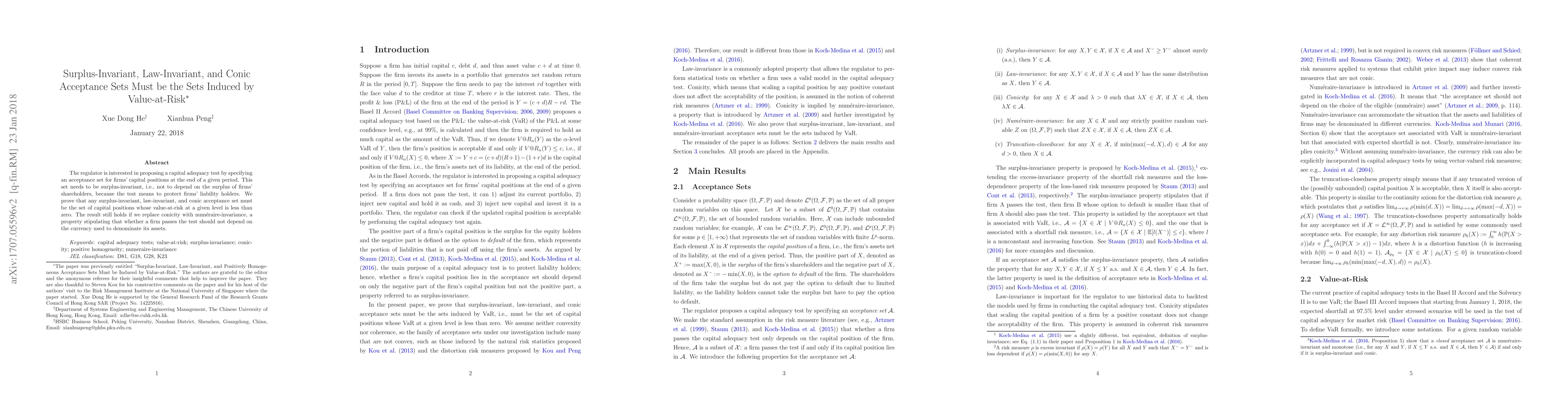 The regulator is interested in proposing a capital adequacy test by specifying an acceptance set for firms' capital positions at the end of a given period. This set needs to be surplus-invariant, i.e., not to depend on the surplus of firms' shareholders, because the test means to protect firms' liability holders. We prove that any surplus-invariant, law-invariant, and conic acceptance set must be the set of capital positions whose value-at-risk at a given level is less than zero. The result still holds if we replace conicity with numeraire-invariance, a property stipulating that whether a firm passes the test should not depend on the currency used to denominate its assets.