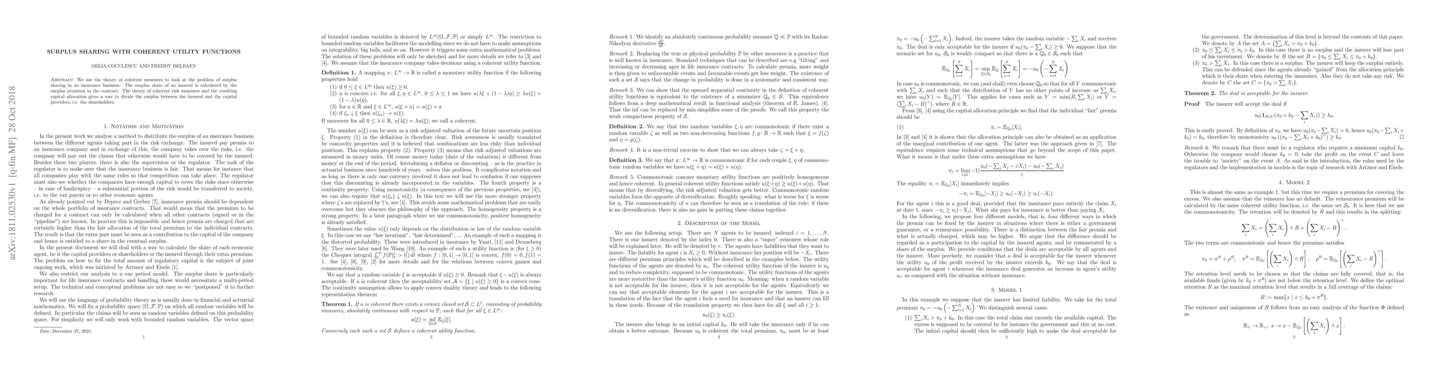 Two-line summary: This paper explores surplus sharing in insurance using coherent measures to determine fair division of surplus premiums between insured parties and shareholders. The approach leverages coherent risk measures for optimal capital allocation.