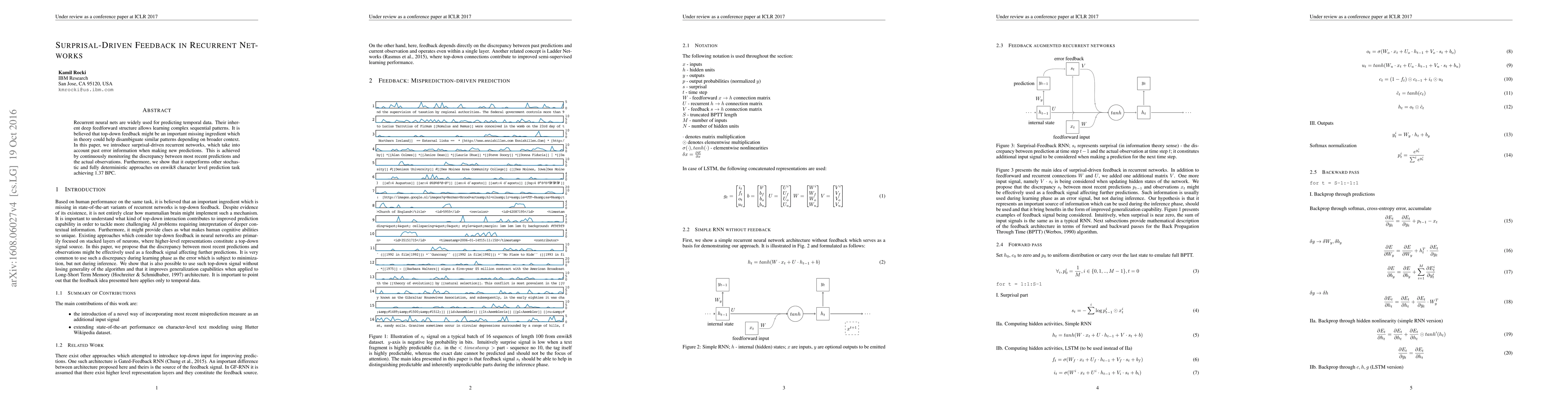 Recurrent neural networks can learn complex sequential patterns with top-down feedback for better prediction outcomes. Surprisal-driven recurrent networks outperform other approaches on character-level prediction tasks, achieving 1.37 BPC on the test portion of the text.