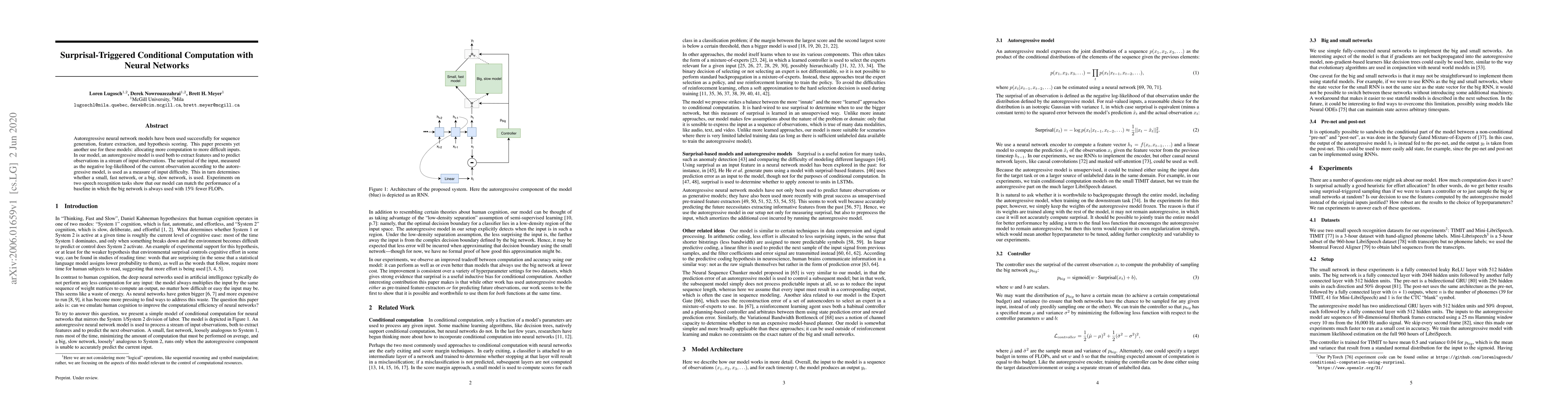 Autoregressive neural network models have been used successfully for sequence generation, feature extraction, and hypothesis scoring. This paper presents yet another use for these models: allocating more computation to more difficult inputs. In our model, an autoregressive model is used both to extract features and to predict observations in a stream of input observations. The surprisal of the input, measured as the negative log-likelihood of the current observation according to the autoregressive model, is used as a measure of input difficulty. This in turn determines whether a small, fast network, or a big, slow network, is used. Experiments on two speech recognition tasks show that our model can match the performance of a baseline in which the big network is always used with 15% fewer FLOPs.