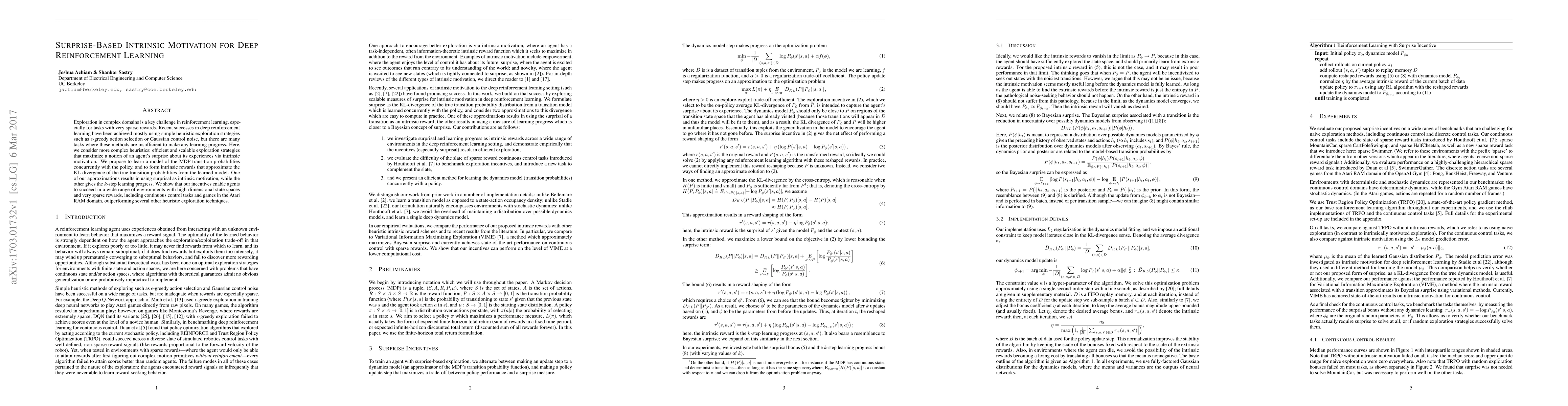 This paper proposes a novel intrinsic motivation mechanism based on surprise to enhance exploration in deep reinforcement learning, enabling agents to effectively tackle sparse reward environments. The method approximates the KL-divergence of transition probabilities, outperforming traditional heuristics in high-dimensional, sparse-reward scenarios.