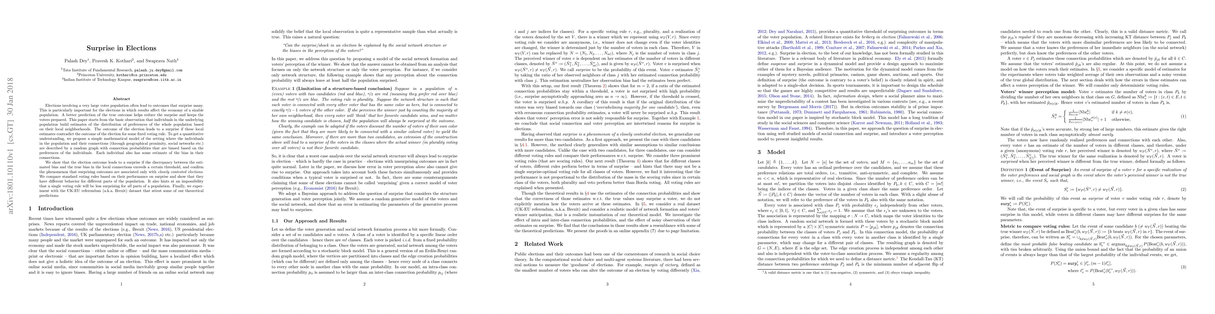 Elections involving a very large voter population often lead to outcomes that surprise many. This is particularly important for the elections in which results affect the economy of a sizable population. A better prediction of the true outcome helps reduce the surprise and keeps the voters prepared. This paper starts from the basic observation that individuals in the underlying population build estimates of the distribution of preferences of the whole population based on their local neighborhoods. The outcome of the election leads to a surprise if these local estimates contradict the outcome of the election for some fixed voting rule. To get a quantitative understanding, we propose a simple mathematical model of the setting where the individuals in the population and their connections (through geographical proximity, social networks etc.) are described by a random graph with connection probabilities that are biased based on the preferences of the individuals. Each individual also has some estimate of the bias in their connections. We show that the election outcome leads to a surprise if the discrepancy between the estimated bias and the true bias in the local connections exceeds a certain threshold, and confirm the phenomenon that surprising outcomes are associated only with {\em closely contested elections}. We compare standard voting rules based on their performance on surprise and show that they have different behavior for different parts of the population. It also hints at an impossibility that a single voting rule will be less surprising for {\em all} parts of a population. Finally, we experiment with the UK-EU referendum (a.k.a.\ Brexit) dataset that attest some of our theoretical predictions.