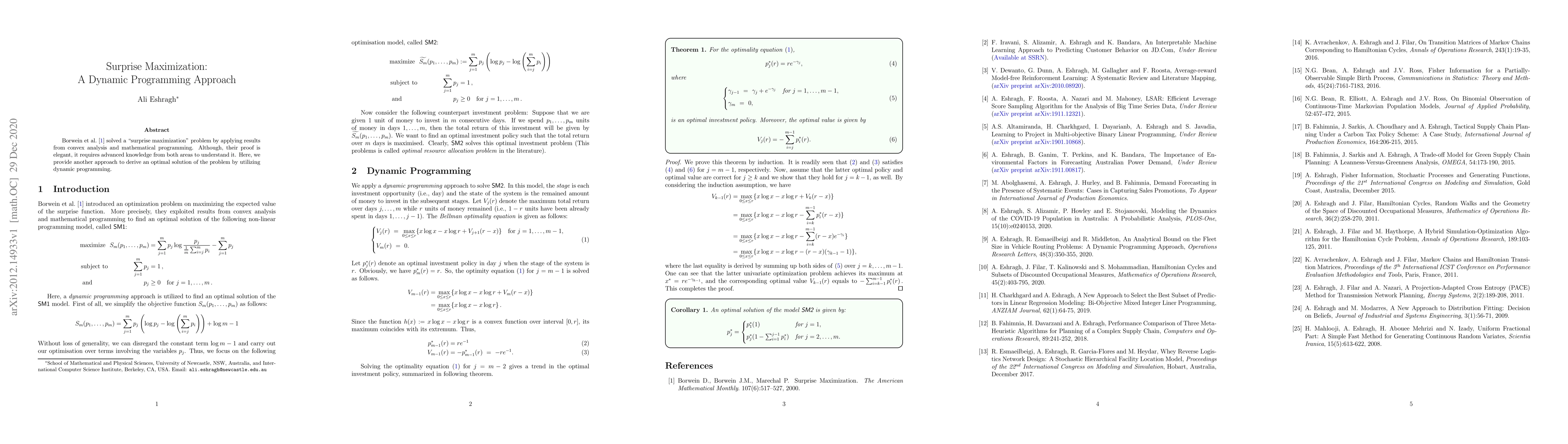 Summary: This paper presents a dynamic programming approach to solve the surprise maximization problem, offering an alternative to the convex analysis and mathematical programming method by Borwein et al. (2000), aiming to make the solution more accessible.