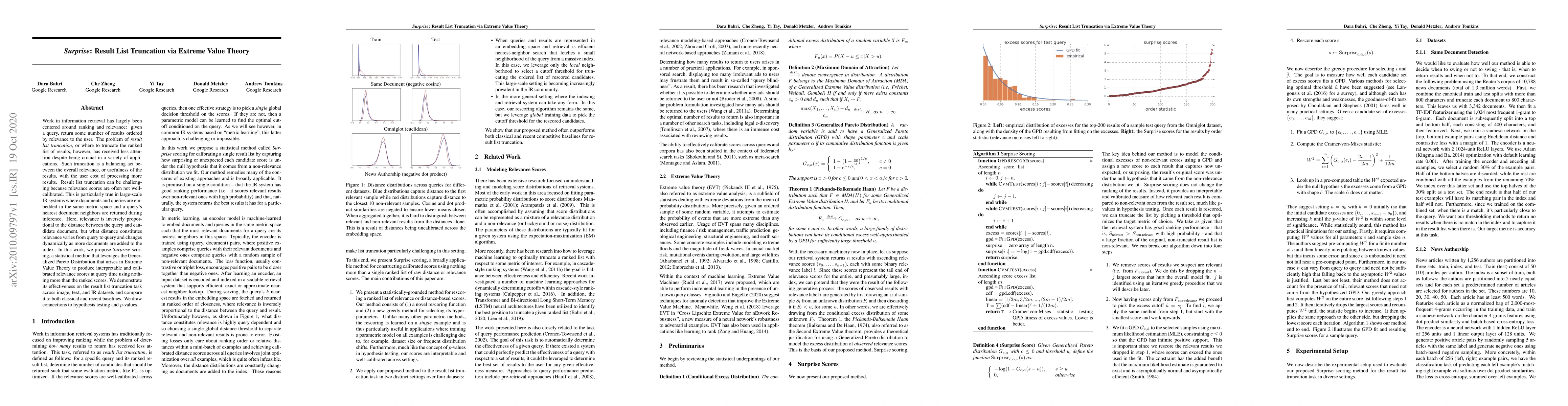 Work in information retrieval has largely been centered around ranking and relevance: given a query, return some number of results ordered by relevance to the user. The problem of result list truncation, or where to truncate the ranked list of results, however, has received less attention despite being crucial in a variety of applications. Such truncation is a balancing act between the overall relevance, or usefulness of the results, with the user cost of processing more results. Result list truncation can be challenging because relevance scores are often not well-calibrated. This is particularly true in large-scale IR systems where documents and queries are embedded in the same metric space and a query's nearest document neighbors are returned during inference. Here, relevance is inversely proportional to the distance between the query and candidate document, but what distance constitutes relevance varies from query to query and changes dynamically as more documents are added to the index. In this work, we propose Surprise scoring, a statistical method that leverages the Generalized Pareto distribution that arises in extreme value theory to produce interpretable and calibrated relevance scores at query time using nothing more than the ranked scores. We demonstrate its effectiveness on the result list truncation task across image, text, and IR datasets and compare it to both classical and recent baselines. We draw connections to hypothesis testing and $p$-values.