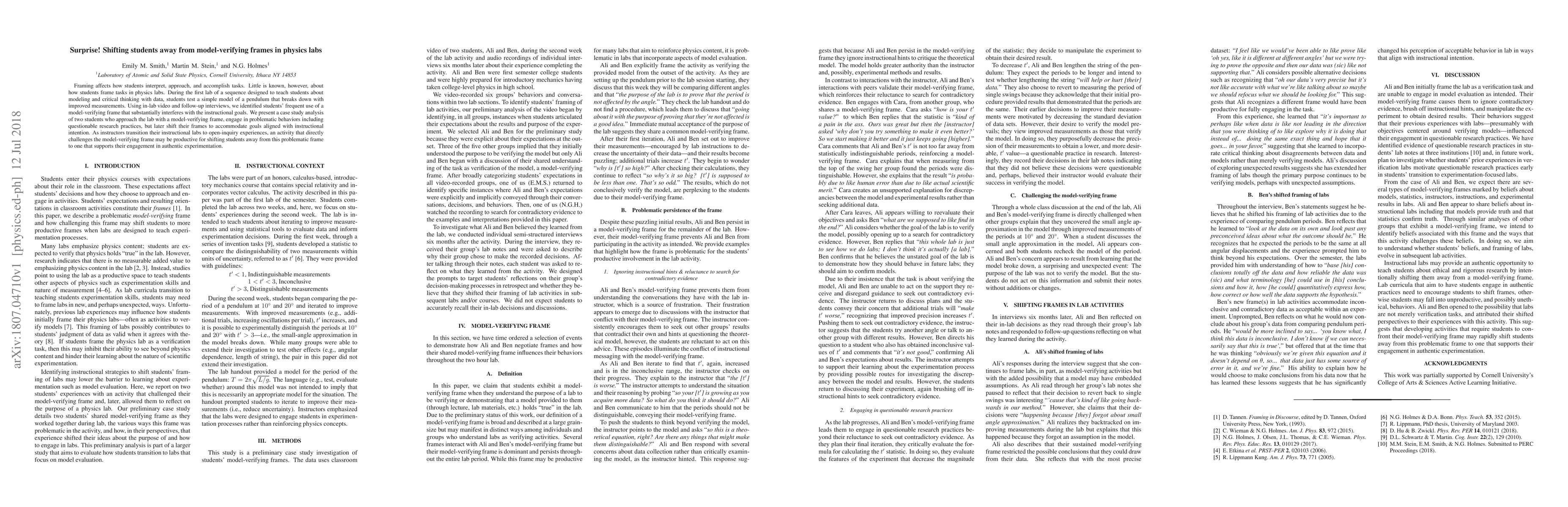 This study reveals that students in physics labs often adopt a 'model-verifying' frame which hinders learning objectives. Through video analysis and interviews, researchers observed students shifting from this frame to a more constructive one after an activity challenging the initial approach.
