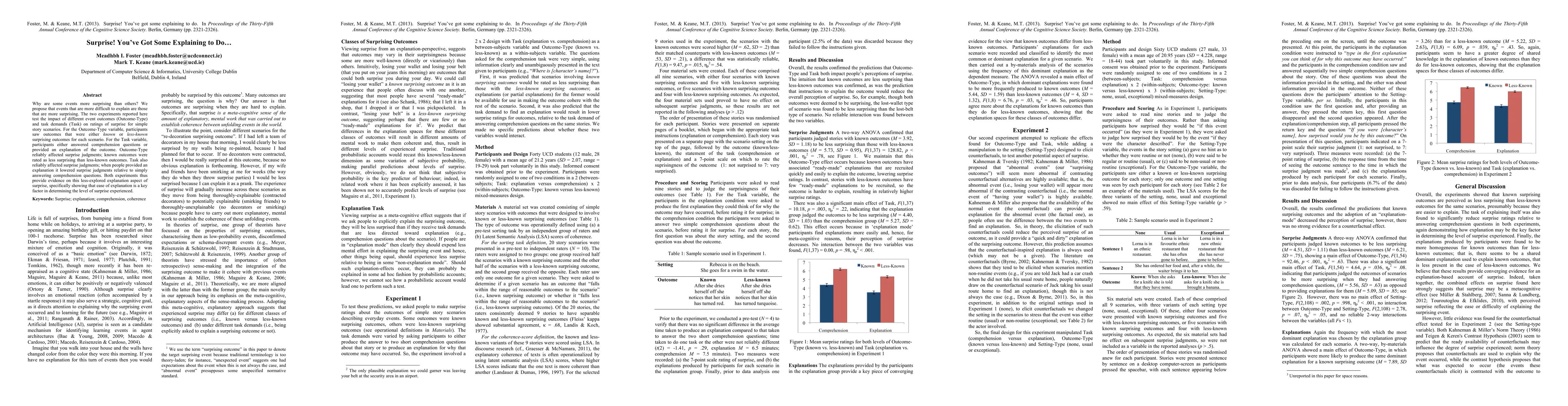 Why are some events more surprising than others? We propose that events that are more difficult to explain are those that are more surprising. The two experiments reported here test the impact of different event outcomes (Outcome-Type) and task demands (Task) on ratings of surprise for simple story scenarios. For the Outcome-Type variable, participants saw outcomes that were either known or less-known surprising outcomes for each scenario. For the Task variable, participants either answered comprehension questions or provided an explanation of the outcome. Outcome-Type reliably affected surprise judgments; known outcomes were rated as less surprising than less-known outcomes. Task also reliably affected surprise judgments; when people provided an explanation it lowered surprise judgments relative to simply answering comprehension questions. Both experiments thus provide evidence on this less-explored explanation aspect of surprise, specifically showing that ease of explanation is a key factor in determining the level of surprise experienced.