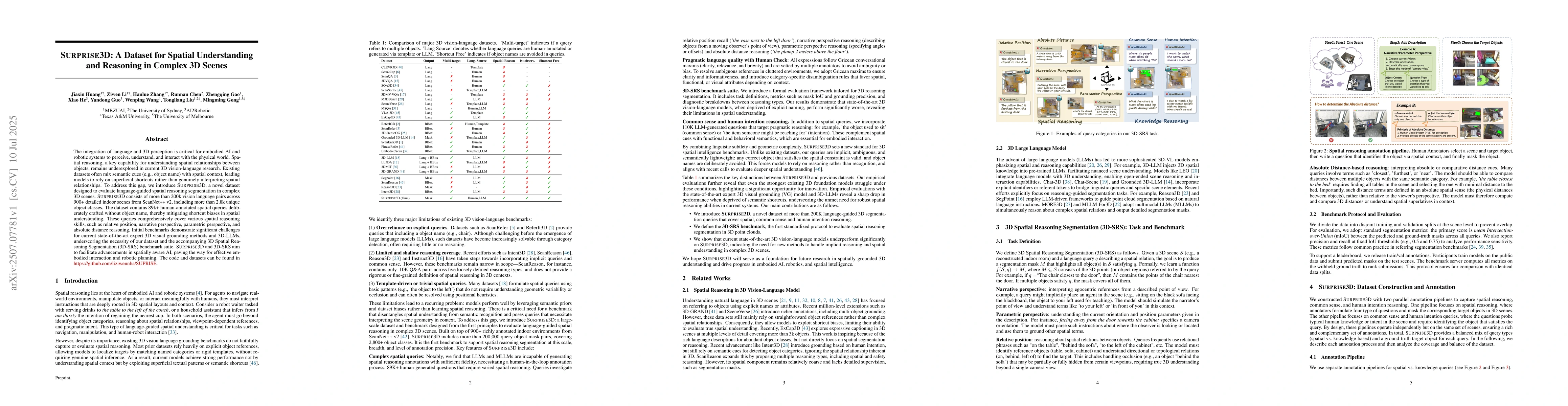 SURPRISE3D dataset and 3D-SRS benchmark suite, designed to evaluate language-guided spatial reasoning segmentation in complex 3D scenes.