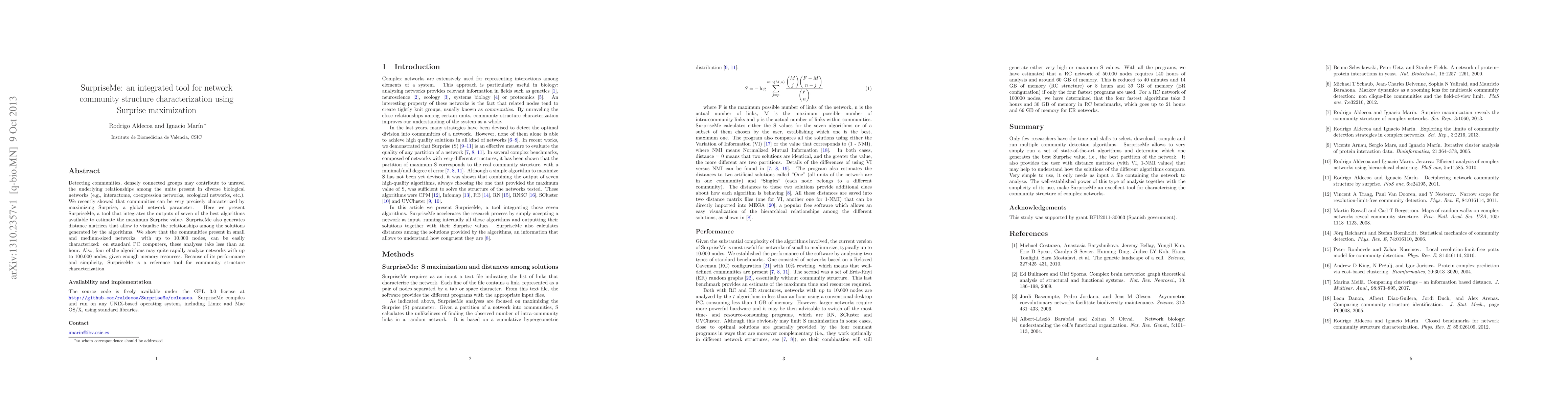 Detecting communities, densely connected groups may contribute to unravel the underlying relationships among the units present in diverse biological networks (e.g., interactome, coexpression networks, ecological networks, etc.). We recently showed that communities can be very precisely characterized by maximizing Surprise, a global network parameter. Here we present SurpriseMe, a tool that integrates the outputs of seven of the best algorithms available to estimate the maximum Surprise value. SurpriseMe also generates distance matrices that allow to visualize the relationships among the solutions generated by the algorithms. We show that the communities present in small and medium-sized networks, with up to 10.000 nodes, can be easily characterized: on standard PC computers, these analyses take less than an hour. Also, four of the algorithms may quite rapidly analyze networks with up to 100.000 nodes, given enough memory resources. Because of its performance and simplicity, SurpriseMe is a reference tool for community structure characterization.