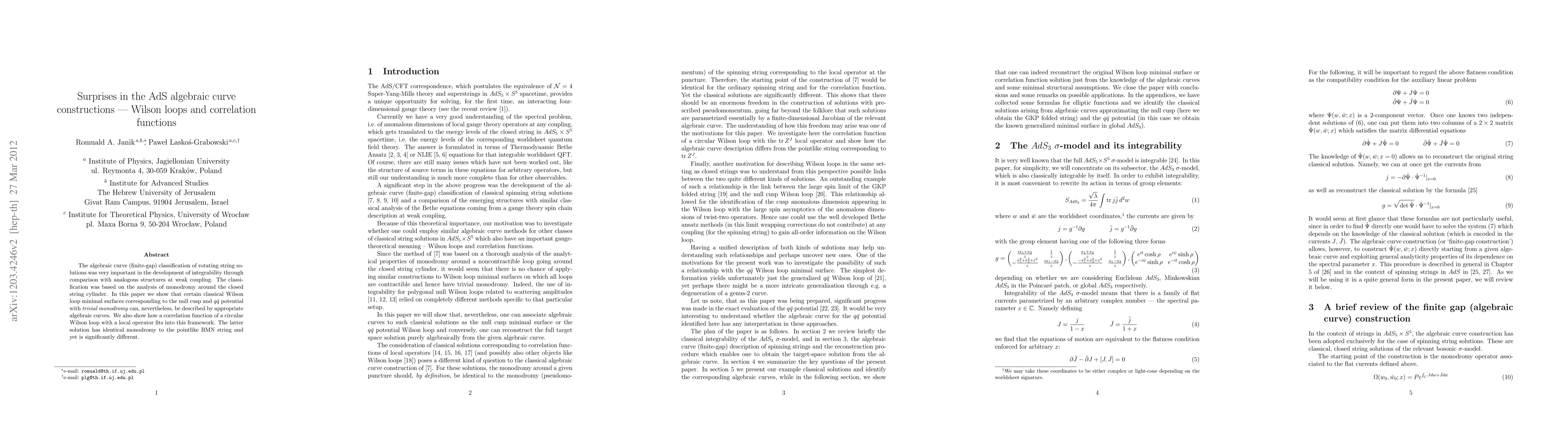 The algebraic curve (finite-gap) classification of rotating string solutions was very important in the development of integrability through comparison with analogous structures at weak coupling. The classification was based on the analysis of monodromy around the closed string cylinder. In this paper we show that certain classical Wilson loop minimal surfaces corresponding to the null cusp and qqbar potential with trivial monodromy can, nevertheless, be described by appropriate algebraic curves. We also show how a correlation function of a circular Wilson loop with a local operator fits into this framework. The latter solution has identical monodromy to the pointlike BMN string and yet is significantly different.