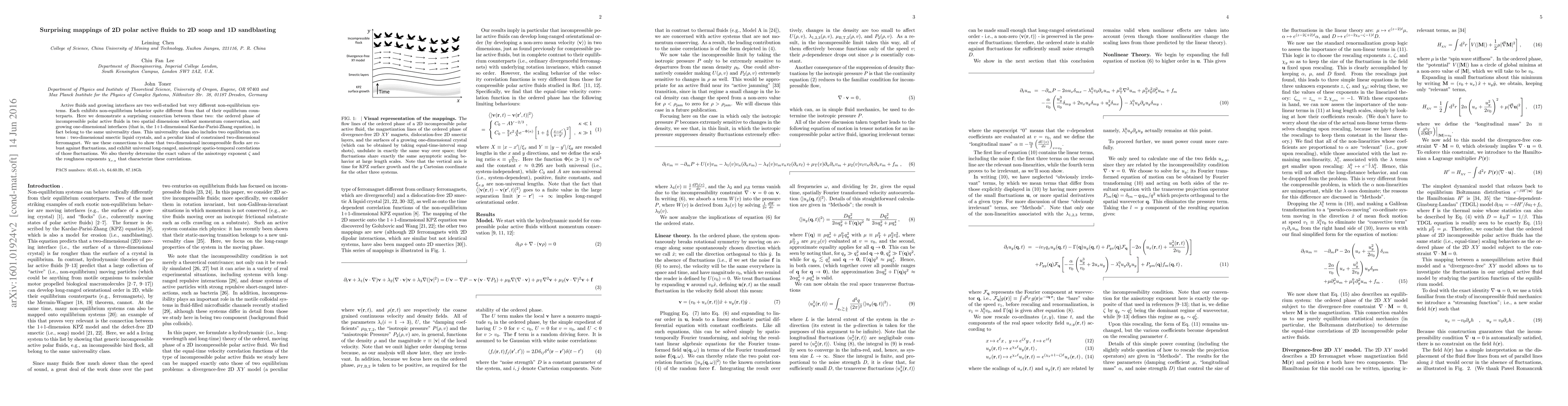 Active fluids and growing interfaces are two well-studied but very different non-equilibrium systems. Each exhibits non-equilibrium behavior quite different from that of their equilibrium counterparts. Here we demonstrate a surprising connection between these two: the ordered phase of incompressible polar active fluids in two spatial dimensions without momentum conservation, and growing one-dimensional interfaces (that is, the 1+1-dimensional Kardar-Parisi-Zhang equation), in fact belong to the same universality class. This universality class also includes two equilibrium systems : two-dimensional smectic liquid crystals, and a peculiar kind of constrained two-dimensional ferromagnet. We use these connections to show that two-dimensional incompressible flocks are robust against fluctuations, and exhibit universal long-ranged, anisotropic spatio-temporal correlations of those fluctuations. We also thereby determine the exact values of the anisotropy exponent $\zeta$ and the roughness exponents $\chi_{_{x,y}}$ that characterize these correlations.
