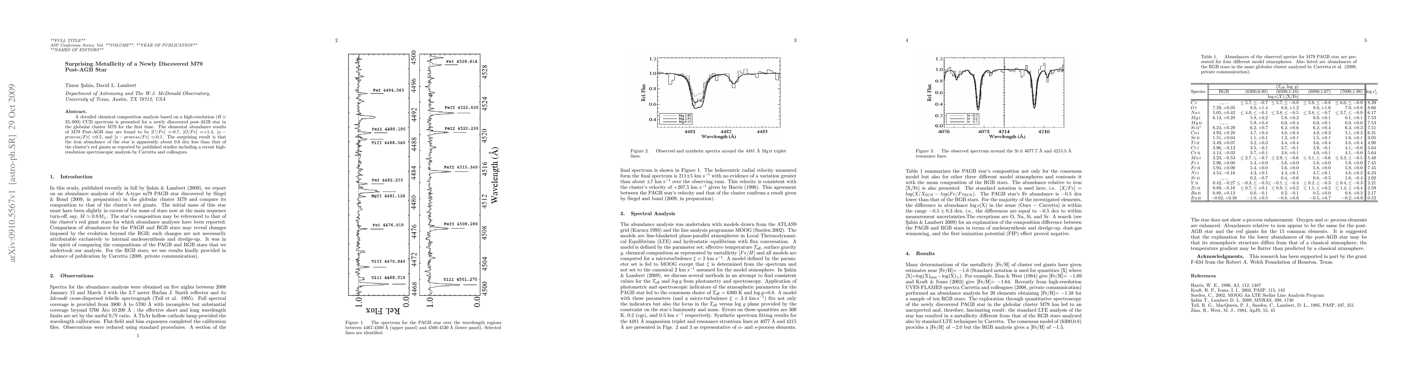 The research presents a detailed chemical composition analysis of a newly discovered post-AGB star in the globular cluster M79 using high-resolution (R=35,000) CCD spectra. The abundance analysis was conducted using models from the ATLAS9 grid and the MOOG line analysis program, considering parameters like effective temperature, surface gravity, metallicity, and microturbulence.