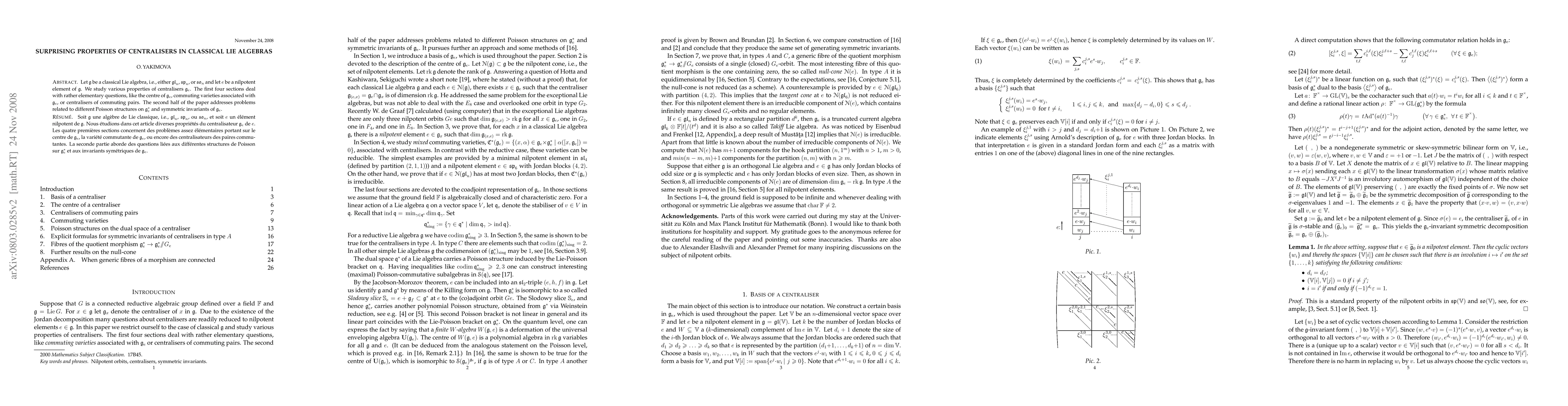 This paper investigates properties of centralisers in classical Lie algebras such as $gl_n$, $sp_n$, and $so_n$ around nilpotent elements. It examines elementary aspects like the centre of the centraliser and commuting varieties, and later delves into Poisson structures on dual spaces and symmetric invariants.