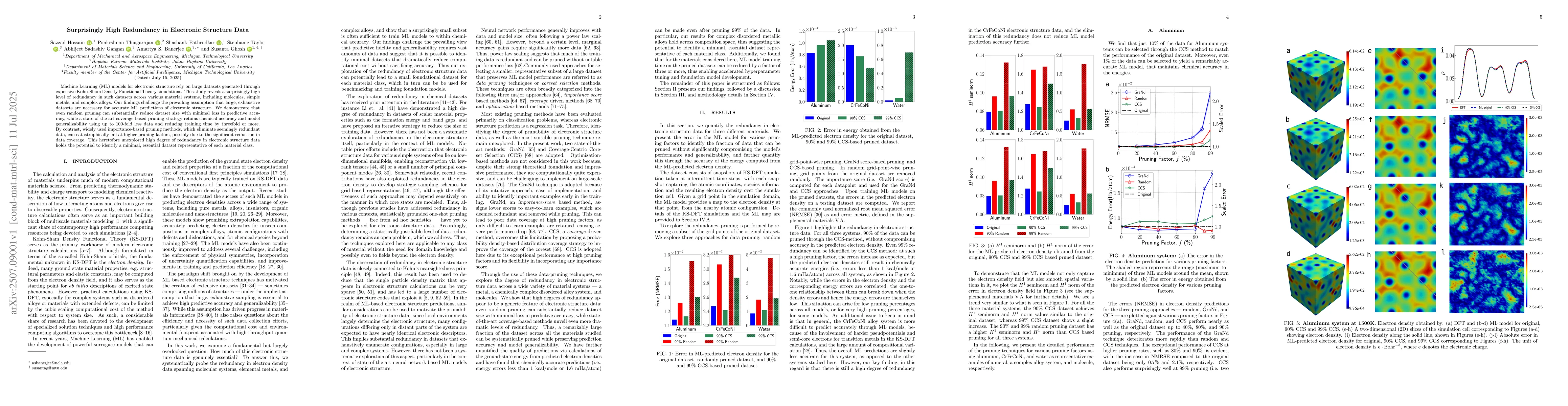 Machine Learning (ML) models for electronic structure rely on large datasets generated through expensive Kohn-Sham Density Functional Theory simulations. This study reveals a surprisingly high level of redundancy in such datasets across various material systems, including molecules, simple metals, and complex alloys. Our findings challenge the prevailing assumption that large, exhaustive datasets are necessary for accurate ML predictions of electronic structure. We demonstrate that even random pruning can substantially reduce dataset size with minimal loss in predictive accuracy, while a state-of-the-art coverage-based pruning strategy retains chemical accuracy and model generalizability using up to 100-fold less data and reducing training time by threefold or more. By contrast, widely used importance-based pruning methods, which eliminate seemingly redundant data, can catastrophically fail at higher pruning factors, possibly due to the significant reduction in data coverage. This heretofore unexplored high degree of redundancy in electronic structure data holds the potential to identify a minimal, essential dataset representative of each material class.