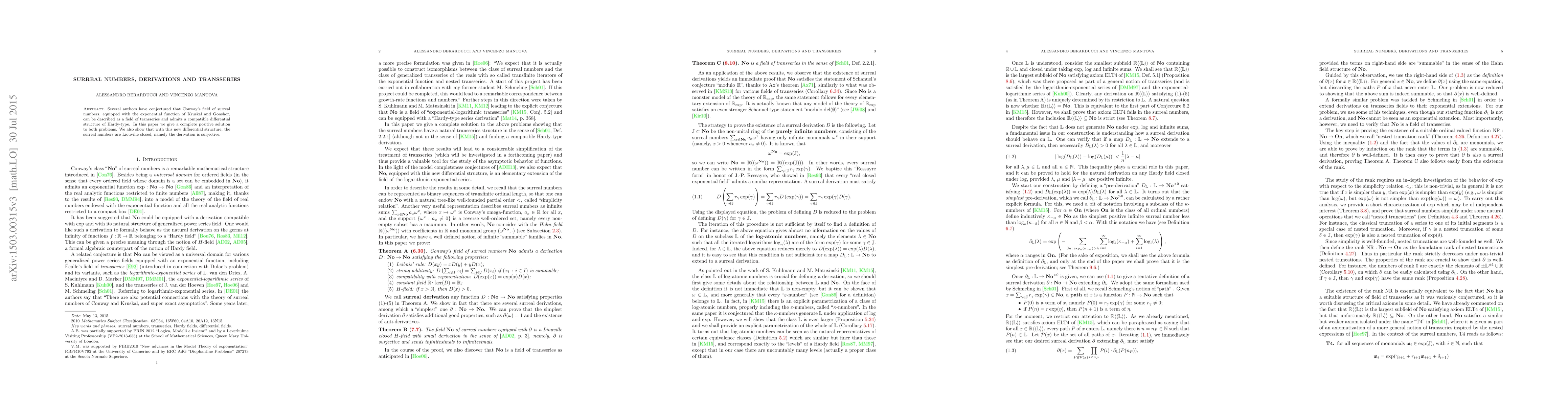The paper's primary technical contribution is the construction of a surreal derivation ∂ that respects the field structure of surreal numbers equipped with the Kruskal-Gonshor exponential, and the proof that surreal numbers are Liouville closed under this derivation.