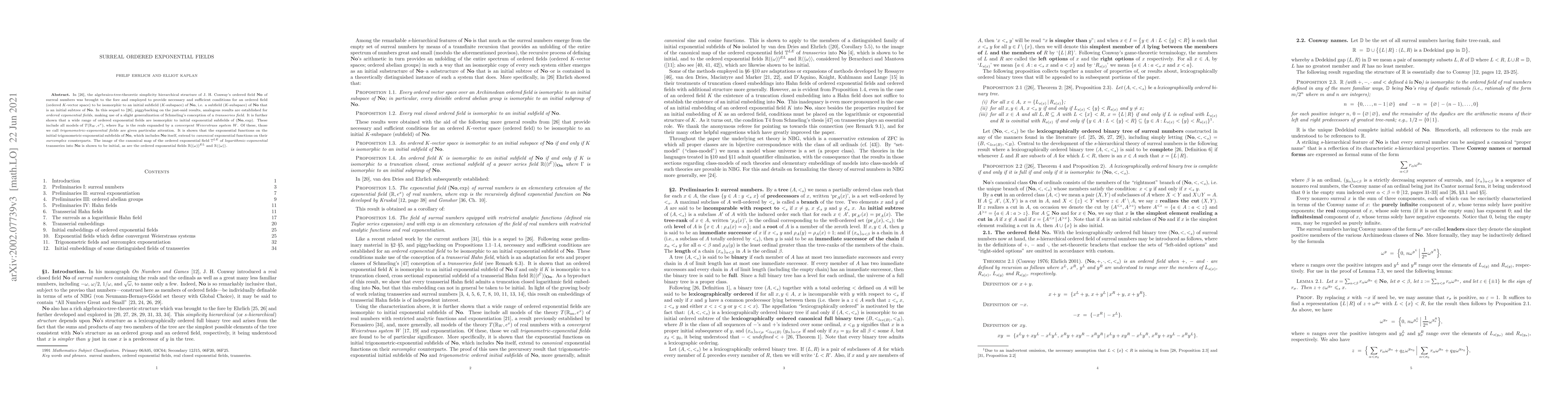 This paper extends Conway's algebraico-tree-theoretic framework for surreal numbers to ordered exponential fields, establishing conditions for isomorphism to initial subfields of $\mathbf{No}$. It also explores the canonical extension of exponential functions in these fields and highlights the isomorphism of certain logarithmic-exponential transseries fields.