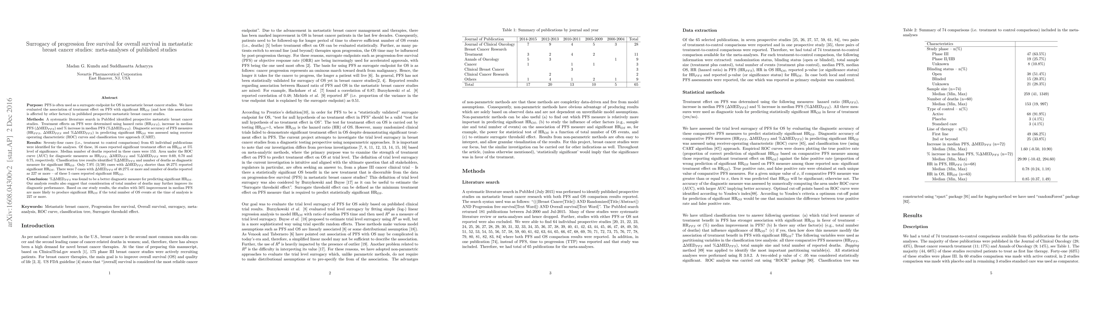 Purpose: PFS is often used as a surrogate endpoint for OS in metastatic breast cancer studies. We have evaluated the association of treatment effect on PFS with significant HR$_{OS}$ (and how this association is affected by other factors) in published prospective metastatic breast cancer studies. Methods: A systematic literature search in PubMed identified prospective metastatic breast cancer studies. Treatments effects on PFS were determined using hazard ratio (HR$_{PFS}$), increase in median PFS ($\Delta$MED$_{PFS}$) and % increase in median PFS (%$\Delta$MED$_{PFS}$). Diagnostic accuracy of PFS measures (HR$_{PFS}$, $\Delta$MED$_{PFS}$ and %$\Delta$MED$_{PFS}$) in predicting significant HR$_{OS}$ was assessed using receiver operating characteristics (ROC) curves and classification trees approach. Results: Seventy-three cases (i.e., treatment to control comparisons) from 64 individual publications were identified for the analyses. Of these, 16 cases reported significant treatment effect on HR$_{OS}$ at 5% level of significance. Median number of deaths reported in these cases were 156. Area under the ROC curve (AUC) for diagnostic measures as HR$_{PFS}$, $\Delta$MED$_{PFS}$ and %$\Delta$MED$_{PFS}$ were 0.69, 0.70 and 0.75, respectively. Classification tree results identified %$\Delta$MED$_{PFS}$ and number of deaths as diagnostic measure for significant HR$_{OS}$. Only 7.9\% (3/39) cases with $\Delta$MED$_{PFS}$ shorter than 48.27\% reported significant HR$_{OS}$. There were 7 cases with $\Delta$MED$_{PFS}$ of 48.27\% or more and number of deaths reported as 227 or more -- of these 5 cases reported significant HR$_{OS}$. Conclusion: %$\Delta$MED$_{PFS}$ was found as better diagnostic measure for significant HR$_{OS}$. Our analysis results also suggest that consideration of total number of deaths may further improve its diagnostic performance.