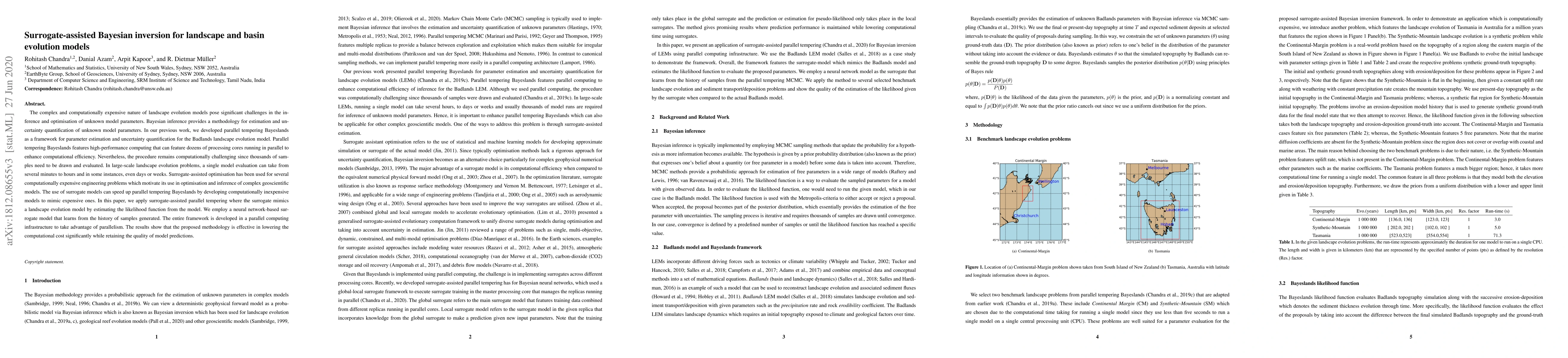 The complex and computationally expensive nature of landscape evolution models pose significant challenges in the inference and optimisation of unknown parameters. Bayesian inference provides a methodology for estimation and uncertainty quantification of unknown model parameters. In our previous work, we developed parallel tempering Bayeslands as a framework for parameter estimation and uncertainty quantification for the Badlands landscape evolution model. Parallel tempering Bayeslands features high-performance computing with dozens of processing cores running in parallel to enhance computational efficiency. Although we use parallel computing, the procedure remains computationally challenging since thousands of samples need to be drawn and evaluated. \textcolor{black}{In large-scale landscape and basin evolution problems, a single model evaluation can take from several minutes to hours, and in some instances, even days. Surrogate-assisted optimisation has been used for several computationally expensive engineering problems which motivate its use in optimisation and inference of complex geoscientific models.} The use of surrogate models can speed up parallel tempering Bayeslands by developing computationally inexpensive models to mimic expensive ones. In this paper, we apply surrogate-assisted parallel tempering where that surrogate mimics a landscape evolution model by estimating the likelihood function from the model. \textcolor{black}{We employ a neural network-based surrogate model that learns from the history of samples generated. } The entire framework is developed in a parallel computing infrastructure to take advantage of parallelism. The results show that the proposed methodology is effective in lowering the overall computational cost significantly while retaining the quality of solutions.