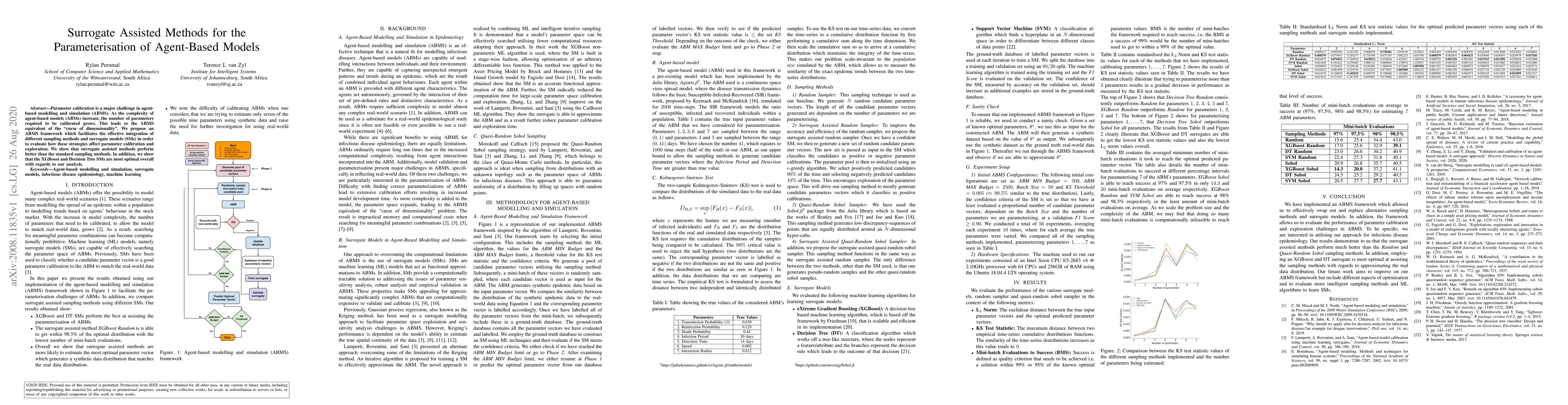 Parameter calibration is a major challenge in agent-based modelling and simulation (ABMS). As the complexity of agent-based models (ABMs) increase, the number of parameters required to be calibrated grows. This leads to the ABMS equivalent of the \say{curse of dimensionality}. We propose an ABMS framework which facilitates the effective integration of different sampling methods and surrogate models (SMs) in order to evaluate how these strategies affect parameter calibration and exploration. We show that surrogate assisted methods perform better than the standard sampling methods. In addition, we show that the XGBoost and Decision Tree SMs are most optimal overall with regards to our analysis.