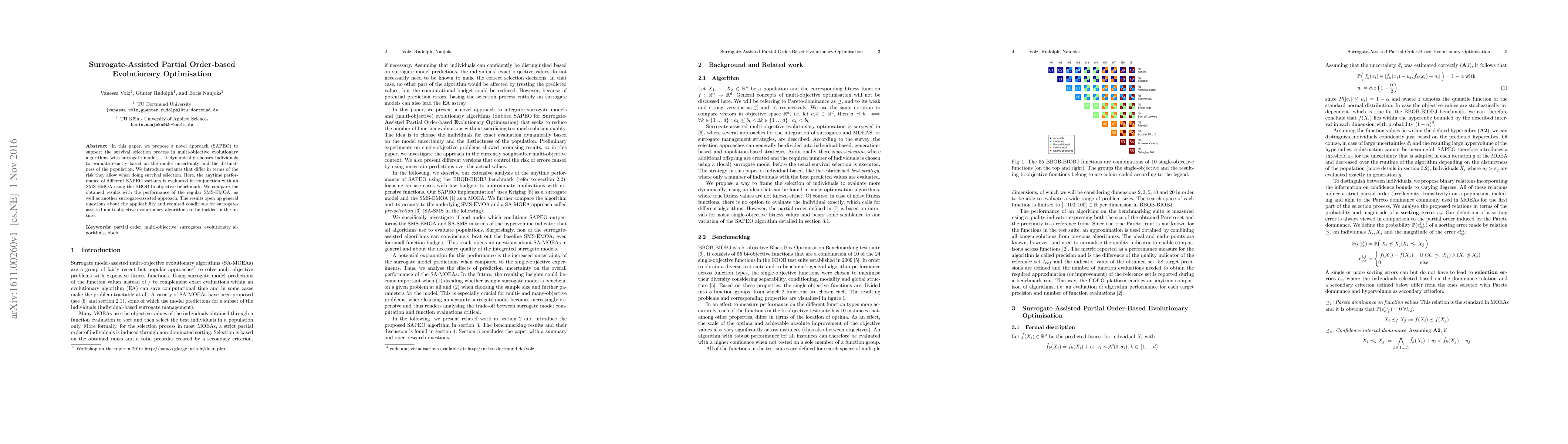 In this paper, we propose a novel approach (SAPEO) to support the survival selection process in multi-objective evolutionary algorithms with surrogate models - it dynamically chooses individuals to evaluate exactly based on the model uncertainty and the distinctness of the population. We introduce variants that differ in terms of the risk they allow when doing survival selection. Here, the anytime performance of different SAPEO variants is evaluated in conjunction with an SMS-EMOA using the BBOB bi-objective benchmark. We compare the obtained results with the performance of the regular SMS-EMOA, as well as another surrogate-assisted approach. The results open up general questions about the applicability and required conditions for surrogate-assisted multi-objective evolutionary algorithms to be tackled in the future.