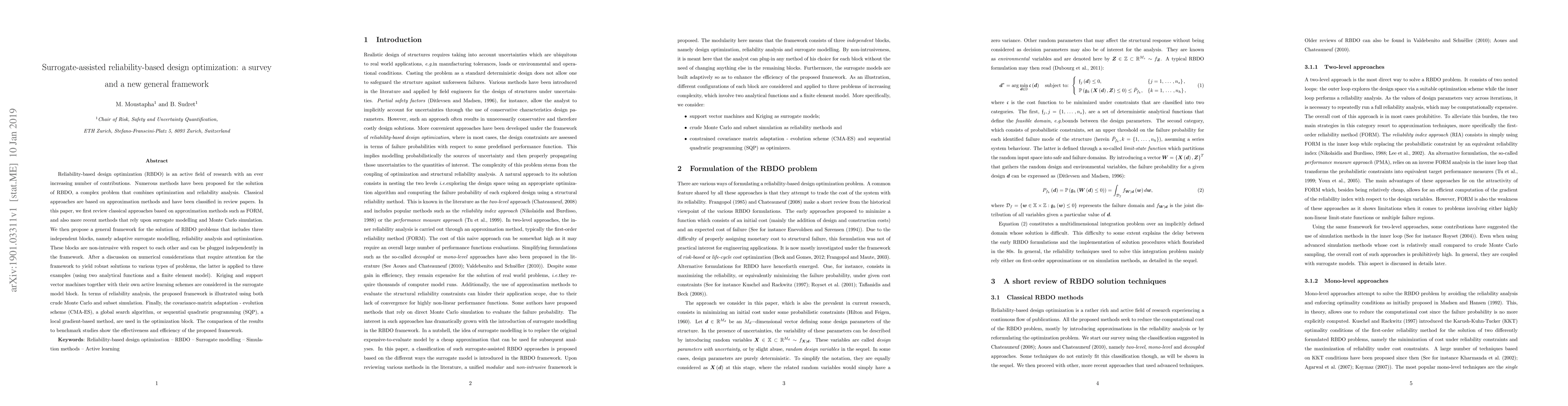 This paper surveys classical and modern methods for reliability-based design optimization (RBDO), proposing a new general framework that integrates adaptive surrogate modelling, reliability analysis, and optimization. The framework's effectiveness is demonstrated through three examples, showing its robustness and efficiency compared to benchmark studies.