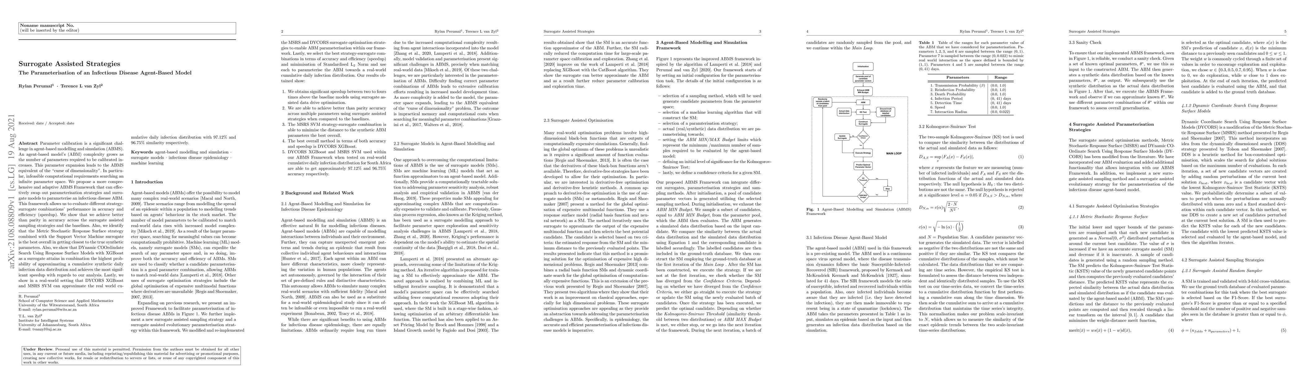 Parameter calibration is a significant challenge in agent-based modelling and simulation (ABMS). An agent-based model's (ABM) complexity grows as the number of parameters required to be calibrated increases. This parameter expansion leads to the ABMS equivalent of the \say{curse of dimensionality}. In particular, infeasible computational requirements searching an infinite parameter space. We propose a more comprehensive and adaptive ABMS Framework that can effectively swap out parameterisation strategies and surrogate models to parameterise an infectious disease ABM. This framework allows us to evaluate different strategy-surrogate combinations' performance in accuracy and efficiency (speedup). We show that we achieve better than parity in accuracy across the surrogate assisted sampling strategies and the baselines. Also, we identify that the Metric Stochastic Response Surface strategy combined with the Support Vector Machine surrogate is the best overall in getting closest to the true synthetic parameters. Also, we show that DYnamic COOrdindate Search Using Response Surface Models with XGBoost as a surrogate attains in combination the highest probability of approximating a cumulative synthetic daily infection data distribution and achieves the most significant speedup with regards to our analysis. Lastly, we show in a real-world setting that DYCORS XGBoost and MSRS SVM can approximate the real world cumulative daily infection distribution with $97.12$\% and $96.75$\% similarity respectively.
