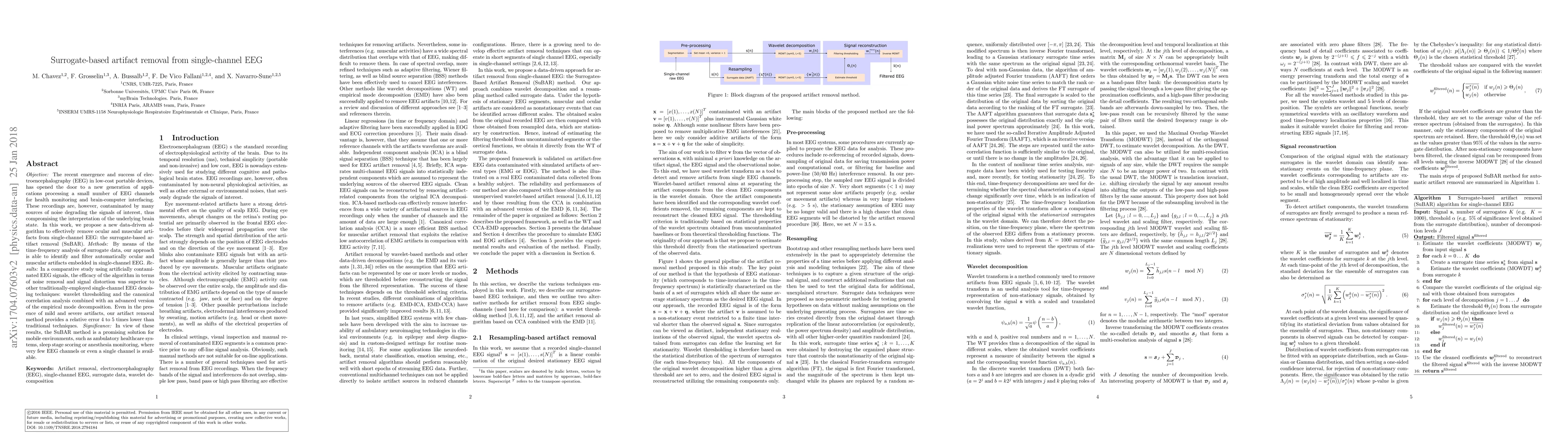 A new algorithm called SuBAR uses time-frequency analysis of surrogate data to effectively remove ocular and muscular artifacts from single-channel EEG signals, outperforming traditional denoising techniques in terms of noise removal and signal distortion.