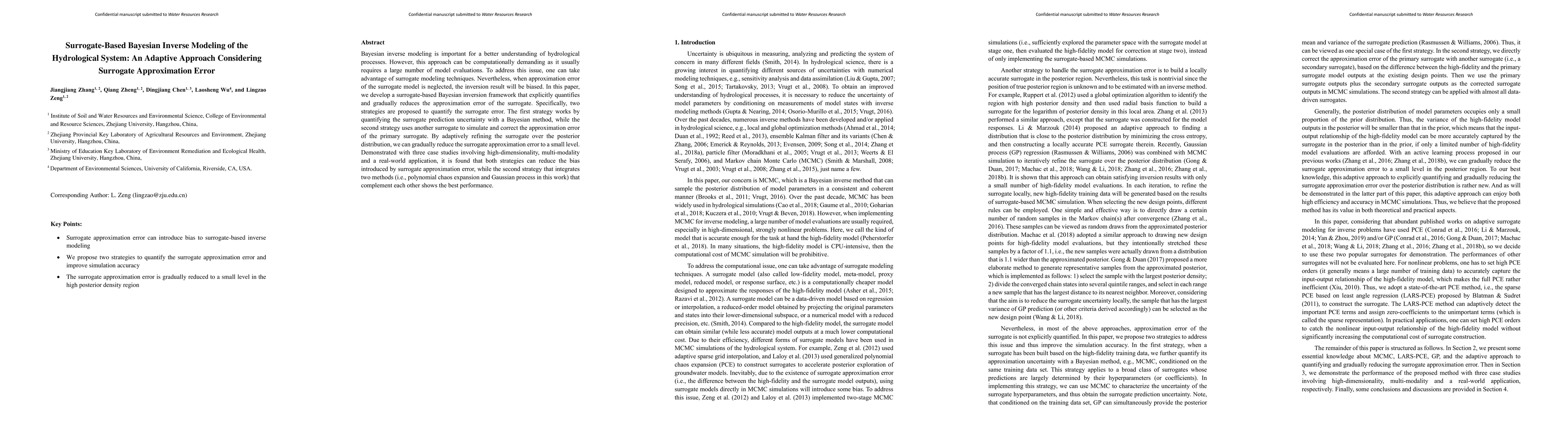 This paper proposes a surrogate-based Bayesian inverse modeling framework that quantifies and reduces surrogate approximation error to improve hydrological process understanding. It employs two strategies: one using Bayesian methods to quantify uncertainty and another using a secondary surrogate to correct errors, achieving better performance in high-dimensional, multimodal cases.