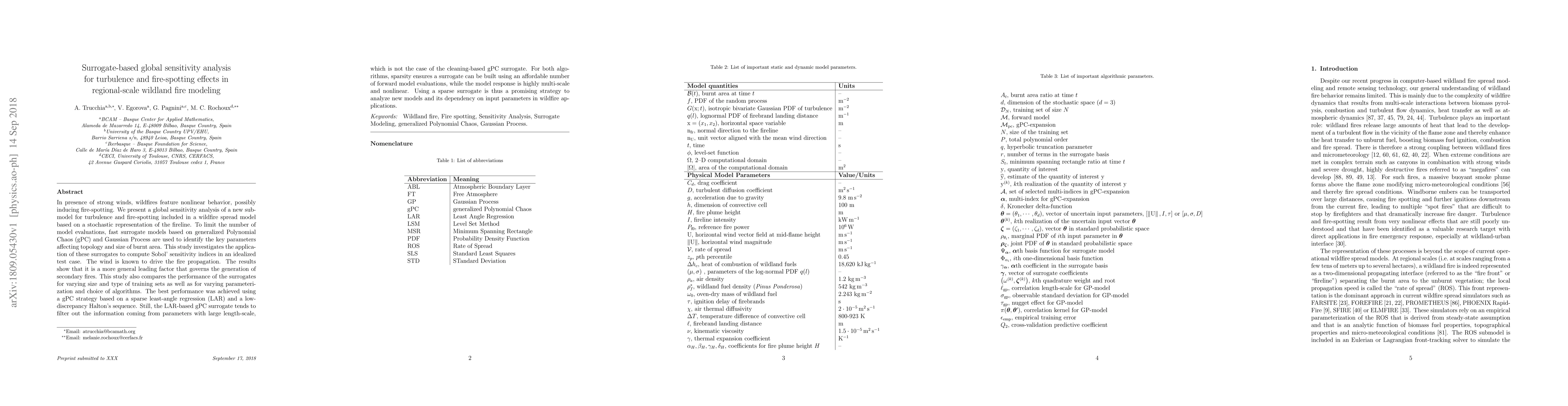 This paper conducts a global sensitivity analysis of a new wildfire spread model incorporating turbulence and fire-spotting using surrogate models. The study finds that wind is a primary driver of fire propagation and secondary fires, with the generalized Polynomial Chaos (gPC) method showing the best performance for identifying key parameters.