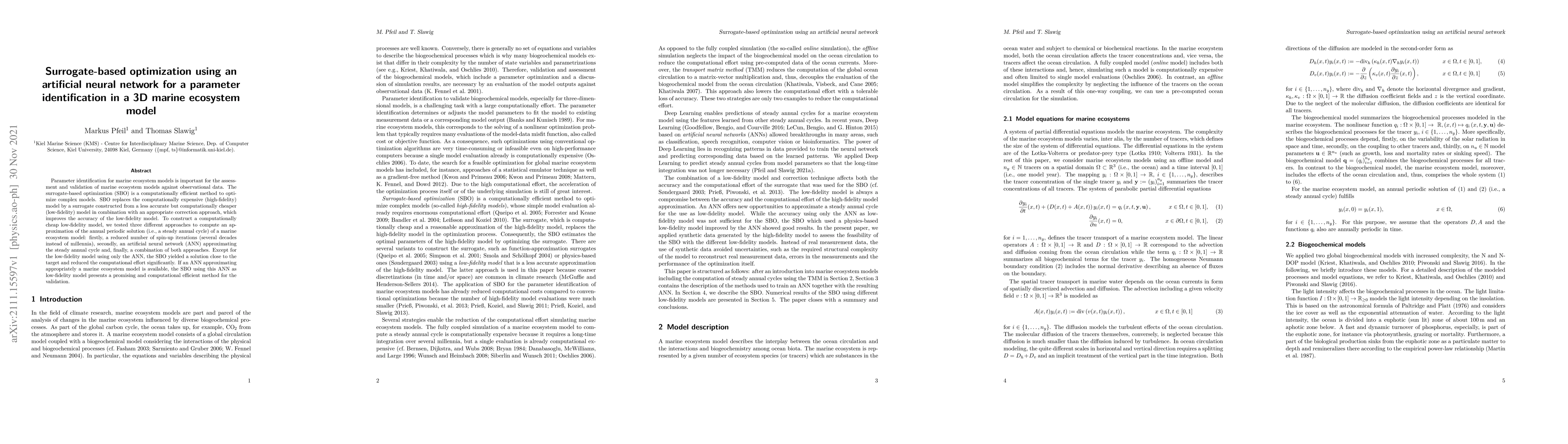 This paper explores surrogate-based optimization (SBO) using an artificial neural network (ANN) to efficiently identify parameters in a 3D marine ecosystem model. The study finds that SBO, especially when using an ANN as a low-fidelity model, significantly reduces computational effort while maintaining accuracy in parameter identification.