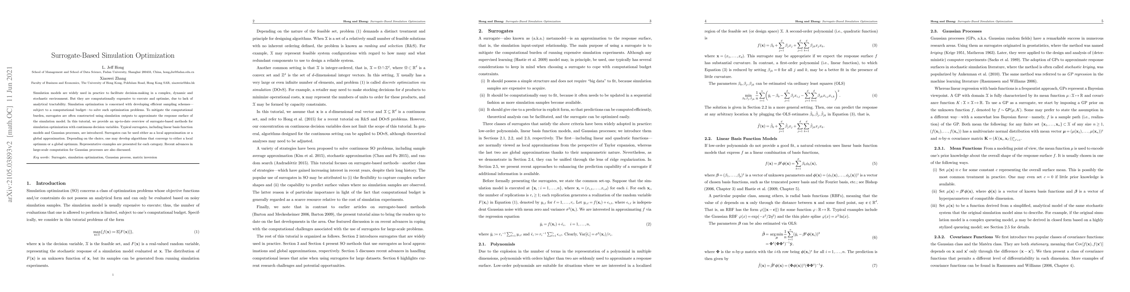 This paper provides an overview of surrogate-based methods for simulation optimization, focusing on continuous decision variables. It discusses various surrogates, such as linear basis function models and Gaussian processes, and their use in local or global approximation strategies to achieve either local or global optima.