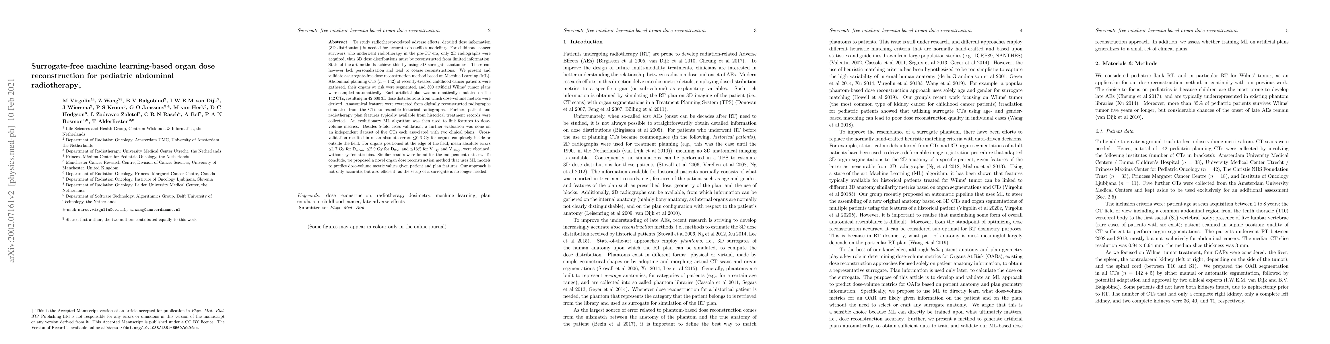 To study radiotherapy-related adverse effects, detailed dose information (3D distribution) is needed for accurate dose-effect modeling. For childhood cancer survivors who underwent radiotherapy in the pre-CT era, only 2D radiographs were acquired, thus 3D dose distributions must be reconstructed from limited information. State-of-the-art methods achieve this by using 3D surrogate anatomies. These can lack personalization and lead to coarse reconstructions. We present and validate a surrogate-free dose reconstruction method based on Machine Learning (ML). Abdominal planning CTs ($n$=142) of recently-treated childhood cancer patients were gathered, their organs at risk were segmented, and 300 artificial Wilms' tumor plans were sampled automatically. Each artificial plan was automatically emulated on the 142 CTs, resulting in 42,600 3D dose distributions from which dose-volume metrics were derived. Anatomical features were extracted from digitally reconstructed radiographs simulated from the CTs to resemble historical radiographs. Further, patient and radiotherapy plan features typically available from historical treatment records were collected. An evolutionary ML algorithm was then used to link features to dose-volume metrics. Besides 5-fold cross-validation, a further evaluation was done on an independent dataset of five CTs each associated with two clinical plans. Cross-validation resulted in Mean Absolute Errors (MAEs) $\leq$0.6 Gy for organs completely inside or outside the field. For organs positioned at the edge of the field, MAEs $\leq$1.7 Gy for D$_{mean}$, $\leq$2.9 Gy for D$_{2cc}$, and $\leq$13% for V$_{5Gy}$ and V$_{10Gy}$, were obtained, without systematic bias. Similar results were found for the independent dataset. Our novel, ML-based organ dose reconstruction method is not only accurate but also efficient, as the setup of a surrogate is no longer needed.