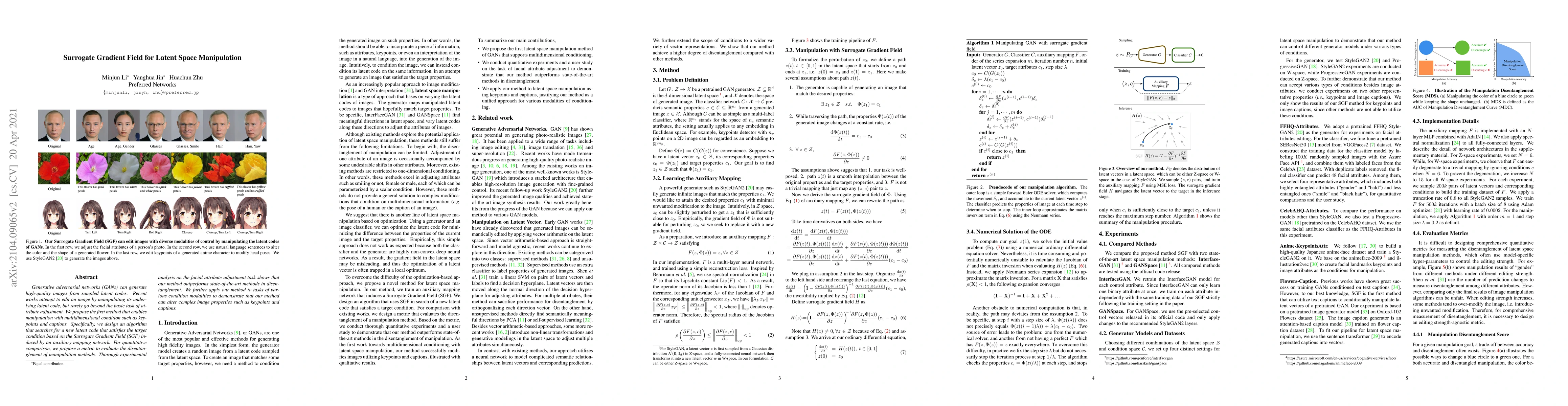 Generative adversarial networks (GANs) can generate high-quality images from sampled latent codes. Recent works attempt to edit an image by manipulating its underlying latent code, but rarely go beyond the basic task of attribute adjustment. We propose the first method that enables manipulation with multidimensional condition such as keypoints and captions. Specifically, we design an algorithm that searches for a new latent code that satisfies the target condition based on the Surrogate Gradient Field (SGF) induced by an auxiliary mapping network. For quantitative comparison, we propose a metric to evaluate the disentanglement of manipulation methods. Thorough experimental analysis on the facial attribute adjustment task shows that our method outperforms state-of-the-art methods in disentanglement. We further apply our method to tasks of various condition modalities to demonstrate that our method can alter complex image properties such as keypoints and captions.
