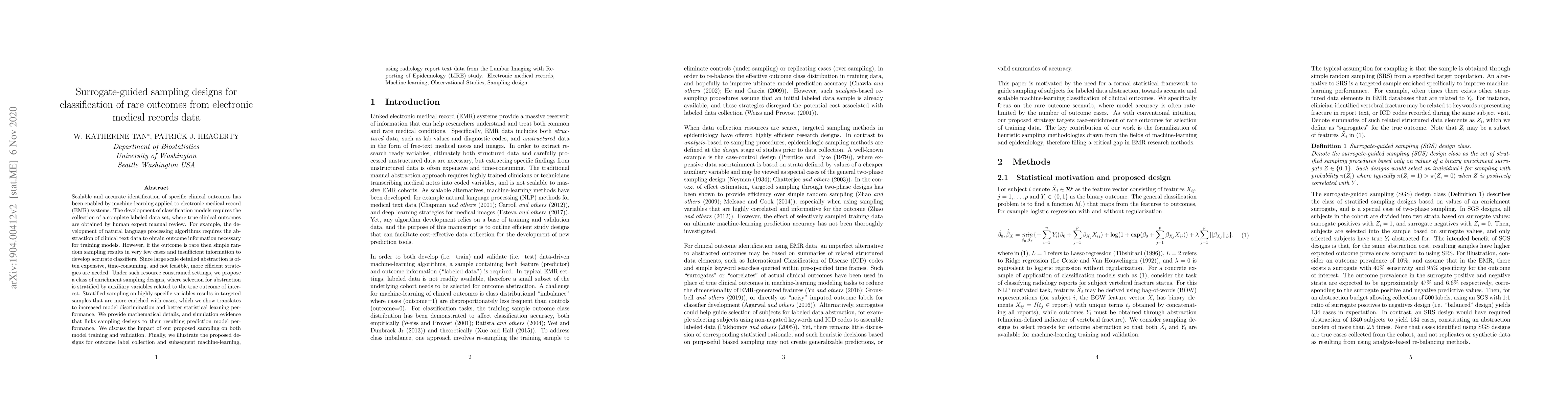 This paper proposes surrogate-guided sampling designs to efficiently identify rare clinical outcomes from electronic medical records, addressing the challenge of insufficient data for accurate classification. The authors suggest stratified sampling based on auxiliary variables to enrich samples, resulting in improved model discrimination and performance, as demonstrated through simulations and a case study using radiology report data from the LIRE study.