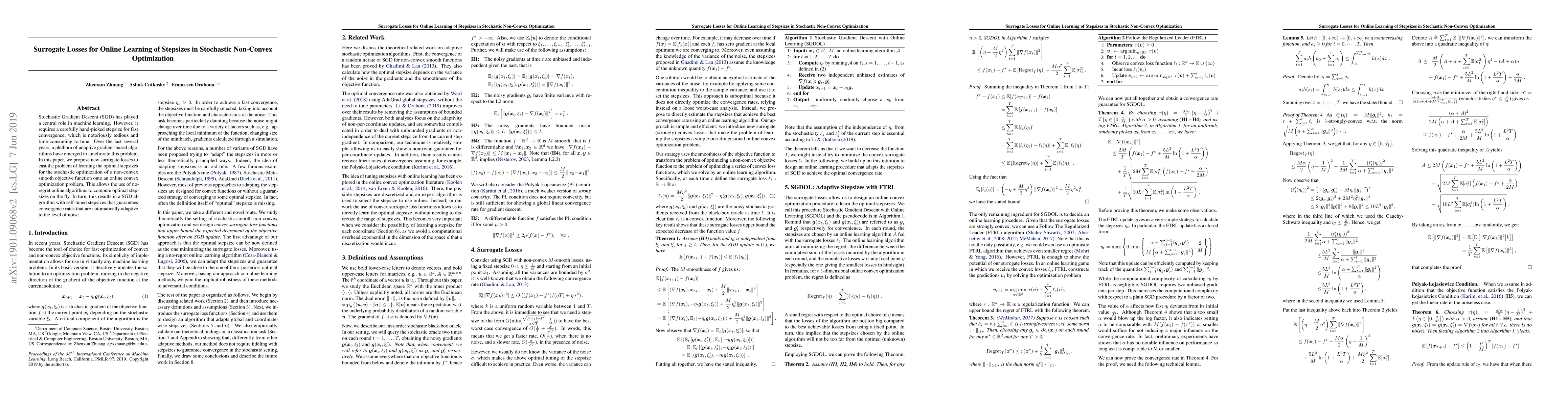 This paper proposes new surrogate losses to transform the stepsize learning problem in stochastic non-convex optimization into an online convex optimization problem, enabling the use of no-regret algorithms for adaptive stepsize computation and guaranteeing convergence rates that adjust to noise levels.