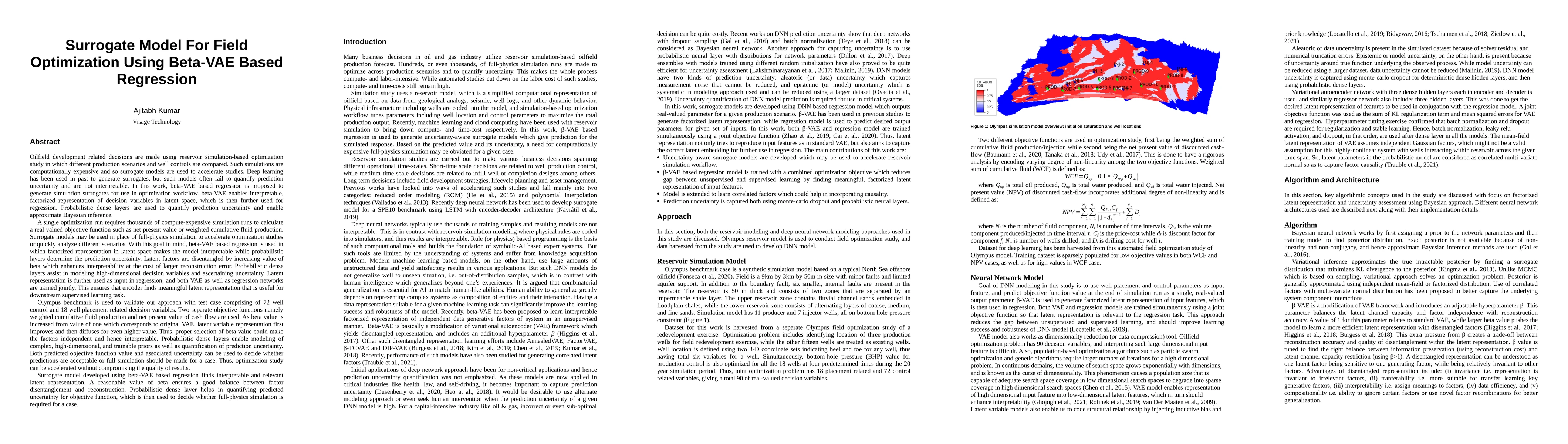 Oilfield development related decisions are made using reservoir simulation-based optimization study in which different production scenarios and well controls are compared. Such simulations are computationally expensive and so surrogate models are used to accelerate studies. Deep learning has been used in past to generate surrogates, but such models often fail to quantify prediction uncertainty and are not interpretable. In this work, beta-VAE based regression is proposed to generate simulation surrogates for use in optimization workflow. beta-VAE enables interpretable, factorized representation of decision variables in latent space, which is then further used for regression. Probabilistic dense layers are used to quantify prediction uncertainty and enable approximate Bayesian inference. Surrogate model developed using beta-VAE based regression finds interpretable and relevant latent representation. A reasonable value of beta ensures a good balance between factor disentanglement and reconstruction. Probabilistic dense layer helps in quantifying predicted uncertainty for objective function, which is then used to decide whether full-physics simulation is required for a case.