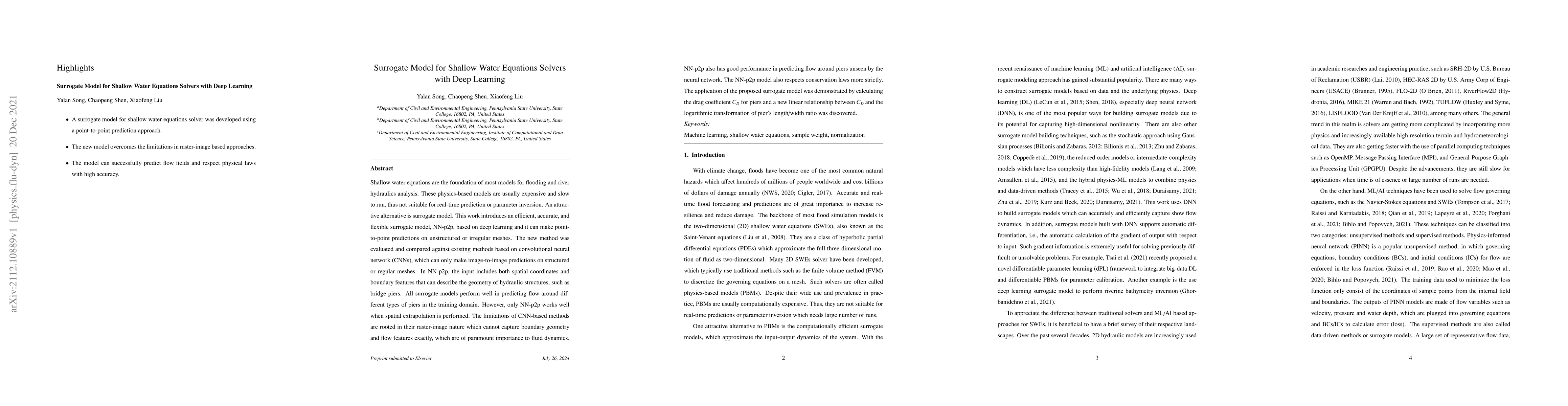 Shallow water equations are the foundation of most models for flooding and river hydraulics analysis. These physics-based models are usually expensive and slow to run, thus not suitable for real-time prediction or parameter inversion. An attractive alternative is surrogate model. This work introduces an efficient, accurate, and flexible surrogate model, NN-p2p, based on deep learning and it can make point-to-point predictions on unstructured or irregular meshes. The new method was evaluated and compared against existing methods based on convolutional neural networks (CNNs), which can only make image-to-image predictions on structured or regular meshes. In NN-p2p, the input includes both spatial coordinates and boundary features that can describe the geometry of hydraulic structures, such as bridge piers. All surrogate models perform well in predicting flow around different types of piers in the training domain. However, only NN-p2p works well when spatial extrapolation is performed. The limitations of CNN-based methods are rooted in their raster-image nature which cannot capture boundary geometry and flow features exactly, which are of paramount importance to fluid dynamics. NN-p2p also has good performance in predicting flow around piers unseen by the neural network. The NN-p2p model also respects conservation laws more strictly. The application of the proposed surrogate model was demonstrated by calculating the drag coefficient $C_D$ for piers and a new linear relationship between $C_D$ and the logarithmic transformation of pier's length/width ratio was discovered.