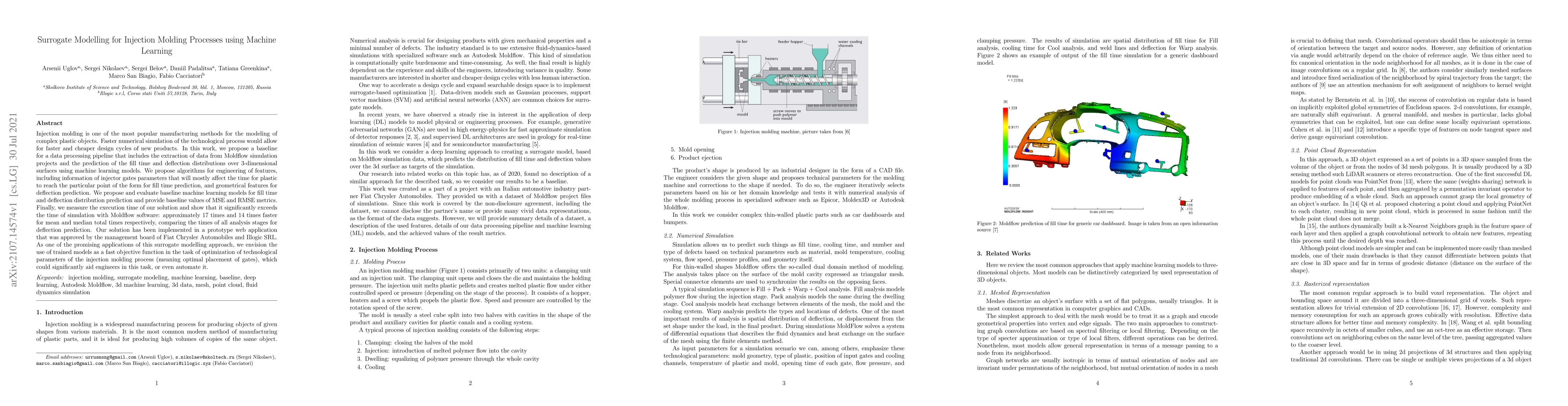 Injection molding is one of the most popular manufacturing methods for the modeling of complex plastic objects. Faster numerical simulation of the technological process would allow for faster and cheaper design cycles of new products. In this work, we propose a baseline for a data processing pipeline that includes the extraction of data from Moldflow simulation projects and the prediction of the fill time and deflection distributions over 3-dimensional surfaces using machine learning models. We propose algorithms for engineering of features, including information of injector gates parameters that will mostly affect the time for plastic to reach the particular point of the form for fill time prediction, and geometrical features for deflection prediction. We propose and evaluate baseline machine learning models for fill time and deflection distribution prediction and provide baseline values of MSE and RMSE metrics. Finally, we measure the execution time of our solution and show that it significantly exceeds the time of simulation with Moldflow software: approximately 17 times and 14 times faster for mean and median total times respectively, comparing the times of all analysis stages for deflection prediction. Our solution has been implemented in a prototype web application that was approved by the management board of Fiat Chrysler Automobiles and Illogic SRL. As one of the promising applications of this surrogate modelling approach, we envision the use of trained models as a fast objective function in the task of optimization of technological parameters of the injection molding process (meaning optimal placement of gates), which could significantly aid engineers in this task, or even automate it.