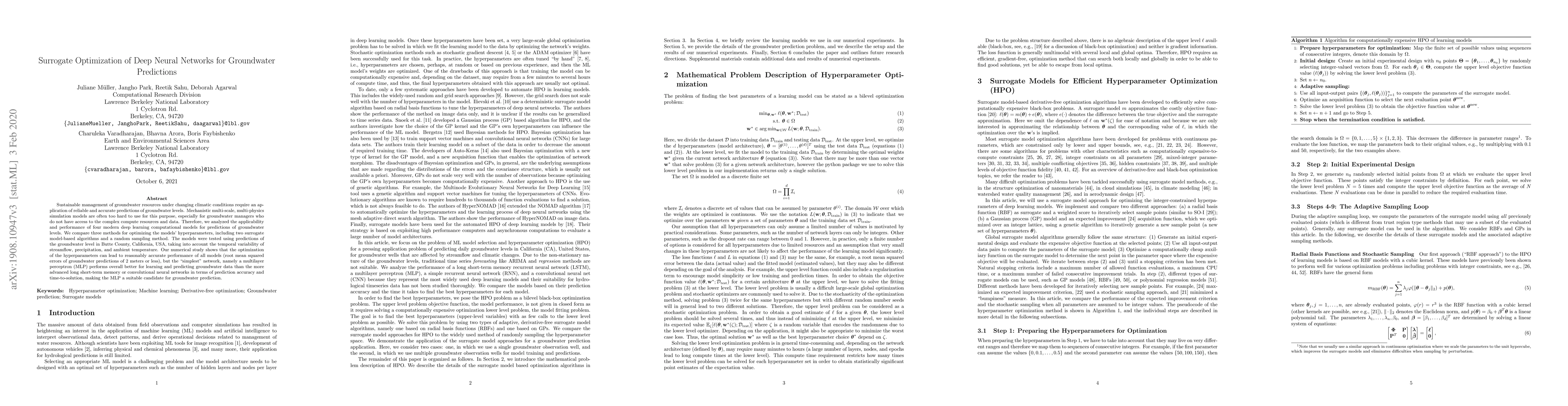 Sustainable management of groundwater resources under changing climatic conditions require an application of reliable and accurate predictions of groundwater levels. Mechanistic multi-scale, multi-physics simulation models are often too hard to use for this purpose, especially for groundwater managers who do not have access to the complex compute resources and data. Therefore, we analyzed the applicability and performance of four modern deep learning computational models for predictions of groundwater levels. We compare three methods for optimizing the models' hyperparameters, including two surrogate model-based algorithms and a random sampling method. The models were tested using predictions of the groundwater level in Butte County, California, USA, taking into account the temporal variability of streamflow, precipitation, and ambient temperature. Our numerical study shows that the optimization of the hyperparameters can lead to reasonably accurate performance of all models (root mean squared errors of groundwater predictions of 2 meters or less), but the ''simplest'' network, namely a multilayer perceptron (MLP) performs overall better for learning and predicting groundwater data than the more advanced long short-term memory or convolutional neural networks in terms of prediction accuracy and time-to-solution, making the MLP a suitable candidate for groundwater prediction.