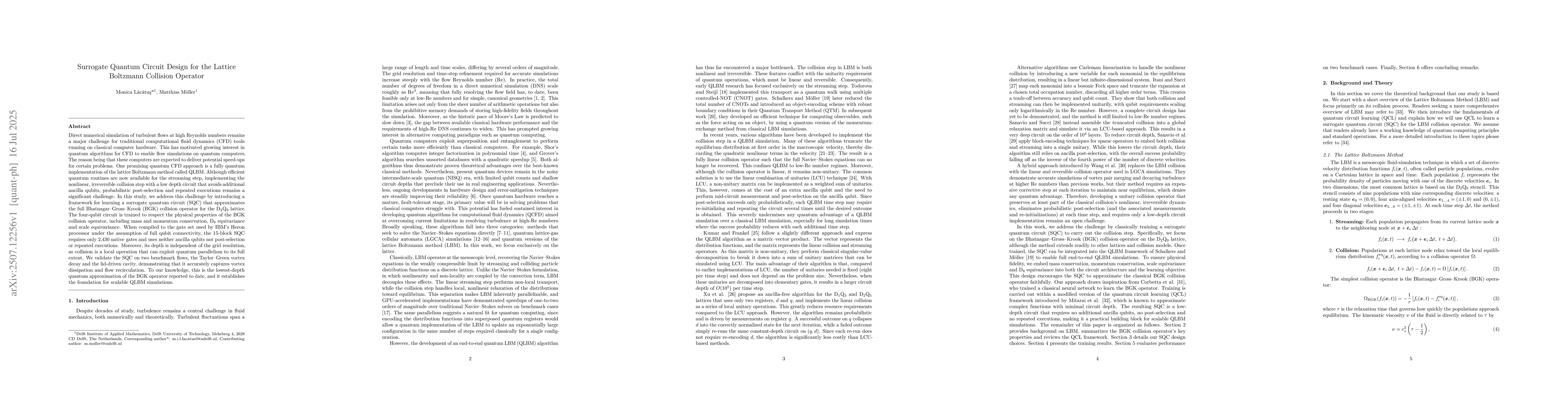 Direct numerical simulation of turbulent flows at high Reynolds numbers remains a major challenge for traditional computational fluid dynamics (CFD) tools running on classical computer hardware. This has motivated growing interest in quantum algorithms for CFD to enable flow simulations on quantum computers. The reason being that these computers are expected to deliver potential speed-ups for certain problems. One promising quantum CFD approach is a fully quantum implementation of the lattice Boltzmann method called QLBM. Although efficient quantum routines are now available for the streaming step, implementing the nonlinear, irreversible collision step with a low depth circuit that avoids additional ancilla qubits, probabilistic post-selection and repeated executions remains a significant challenge. In this study, we address this challenge by introducing a framework for learning a surrogate quantum circuit (SQC) that approximates the full Bhatnagar Gross Krook (BGK) collision operator for the D2Q9 lattice. The four qubit circuit is trained to respect the physical properties of the BGK collision operator, including mass and momentum conservation, D8 equivariance and scale equivariance. When compiled to the gate set used by IBM Heron processor under the assumption of full qubit connectivity, the 15 block SQC requires only 2,430 native gates and uses neither ancilla qubits nor post-selection or repeated executions. Moreover, its depth is independent of the grid resolution, as collision is a local operation that can exploit quantum parallelism to its full extent. We validate the SQC on two benchmark flows, the Taylor Green vortex decay and the lid driven cavity, demonstrating that it accurately captures vortex dissipation and flow recirculation.