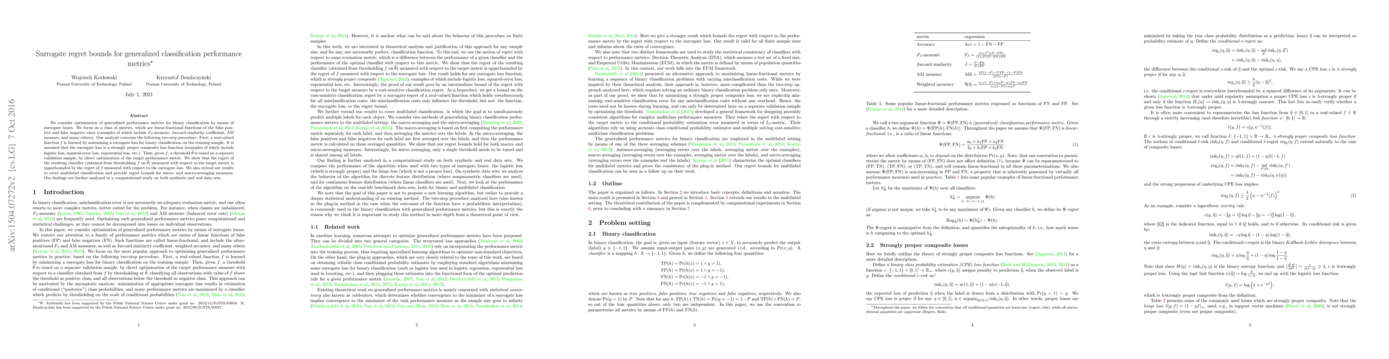 This paper investigates optimization of generalized classification performance metrics using surrogate losses, demonstrating that the regret of classifiers derived from such losses is upperbounded by the regret of the learned function. The results extend to multilabel classification and include computational studies on both synthetic and real datasets.