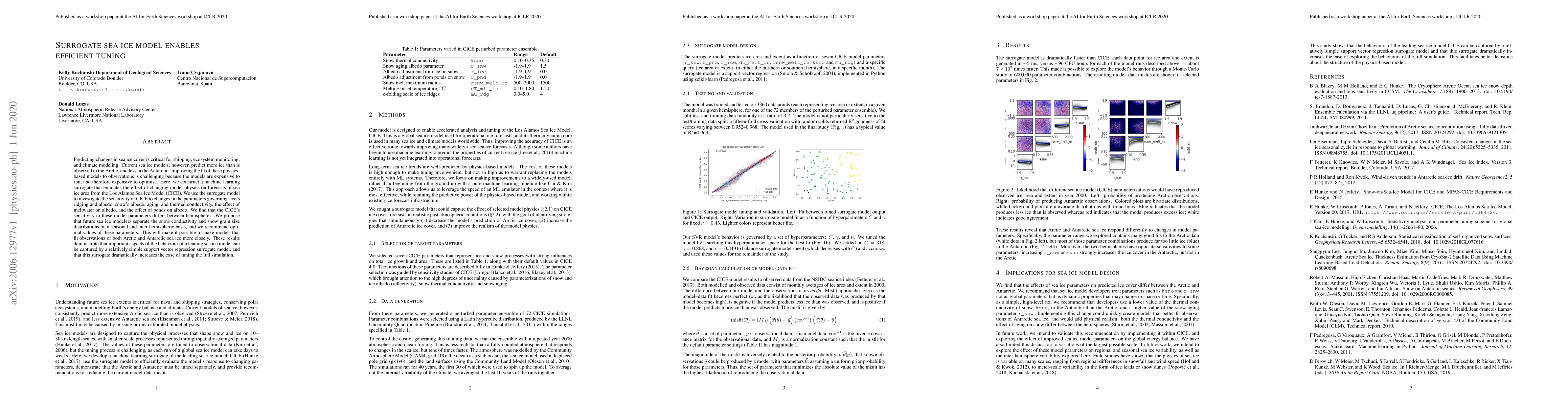 Predicting changes in sea ice cover is critical for shipping, ecosystem monitoring, and climate modeling. Current sea ice models, however, predict more ice than is observed in the Arctic, and less in the Antarctic. Improving the fit of these physics-based models to observations is challenging because the models are expensive to run, and therefore expensive to optimize. Here, we construct a machine learning surrogate that emulates the effect of changing model physics on forecasts of sea ice area from the Los Alamos Sea Ice Model (CICE). We use the surrogate model to investigate the sensitivity of CICE to changes in the parameters governing: ice's ridging and albedo; snow's albedo, aging, and thermal conductivity; the effect of meltwater on albedo; and the effect of ponds on albedo. We find that CICE's sensitivity to these model parameters differs between hemispheres. We propose that future sea ice modelers separate the snow conductivity and snow grain size distributions on a seasonal and inter-hemispheric basis, and we recommend optimal values of these parameters. This will make it possible to make models that fit observations of both Arctic and Antarctic sea ice more closely. These results demonstrate that important aspects of the behavior of a leading sea ice model can be captured by a relatively simple support vector regression surrogate model, and that this surrogate dramatically increases the ease of tuning the full simulation.
