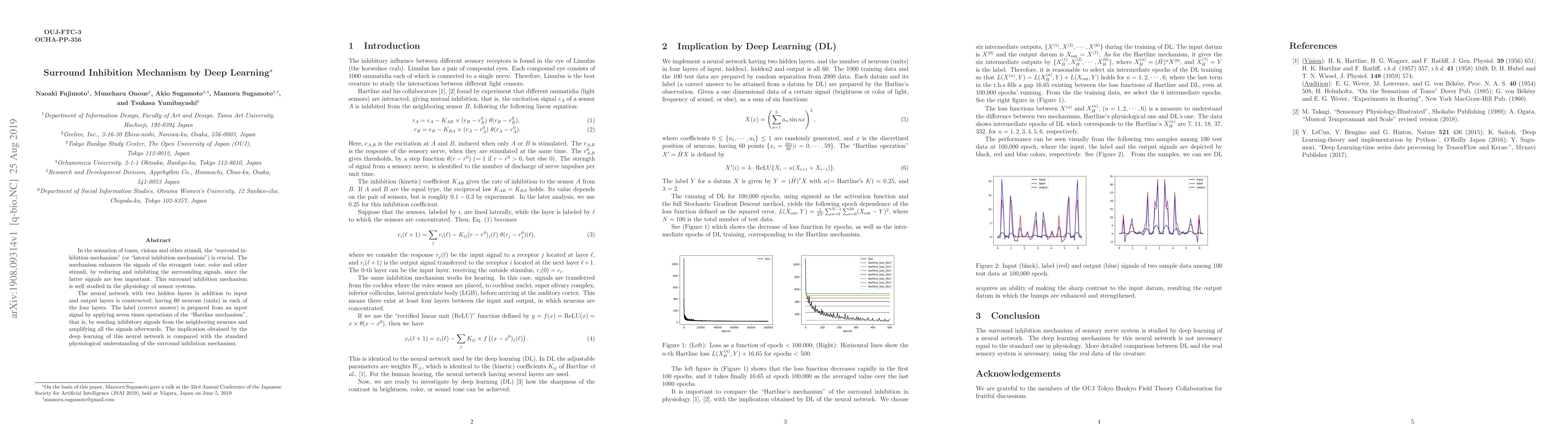 In the sensation of tones, visions and other stimuli, the "surround inhibition mechanism" (or "lateral inhibition mechanism") is crucial. The mechanism enhances the signals of the strongest tone, color and other stimuli, by reducing and inhibiting the surrounding signals, since the latter signals are less important. This surround inhibition mechanism is well studied in the physiology of sensor systems. The neural network with two hidden layers in addition to input and output layers is constructed; having 60 neurons (units) in each of the four layers. The label (correct answer) is prepared from an input signal by applying seven times operations of the "Hartline mechanism", that is, by sending inhibitory signals from the neighboring neurons and amplifying all the signals afterwards. The implication obtained by the deep learning of this neural network is compared with the standard physiological understanding of the surround inhibition mechanism.