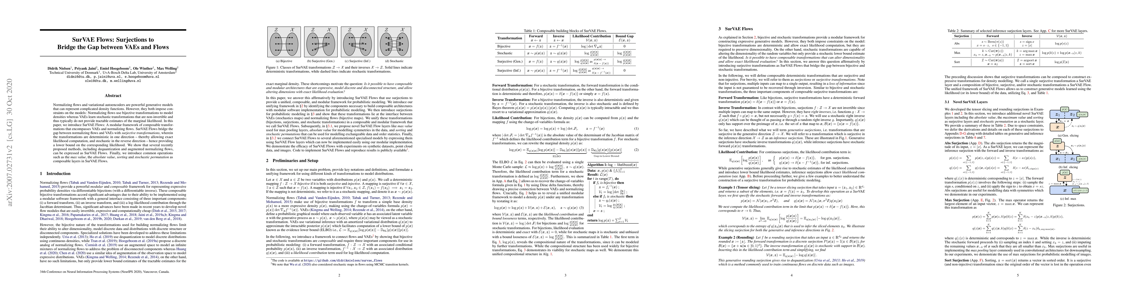 Normalizing flows and variational autoencoders are powerful generative models that can represent complicated density functions. However, they both impose constraints on the models: Normalizing flows use bijective transformations to model densities whereas VAEs learn stochastic transformations that are non-invertible and thus typically do not provide tractable estimates of the marginal likelihood. In this paper, we introduce SurVAE Flows: A modular framework of composable transformations that encompasses VAEs and normalizing flows. SurVAE Flows bridge the gap between normalizing flows and VAEs with surjective transformations, wherein the transformations are deterministic in one direction -- thereby allowing exact likelihood computation, and stochastic in the reverse direction -- hence providing a lower bound on the corresponding likelihood. We show that several recently proposed methods, including dequantization and augmented normalizing flows, can be expressed as SurVAE Flows. Finally, we introduce common operations such as the max value, the absolute value, sorting and stochastic permutation as composable layers in SurVAE Flows.
