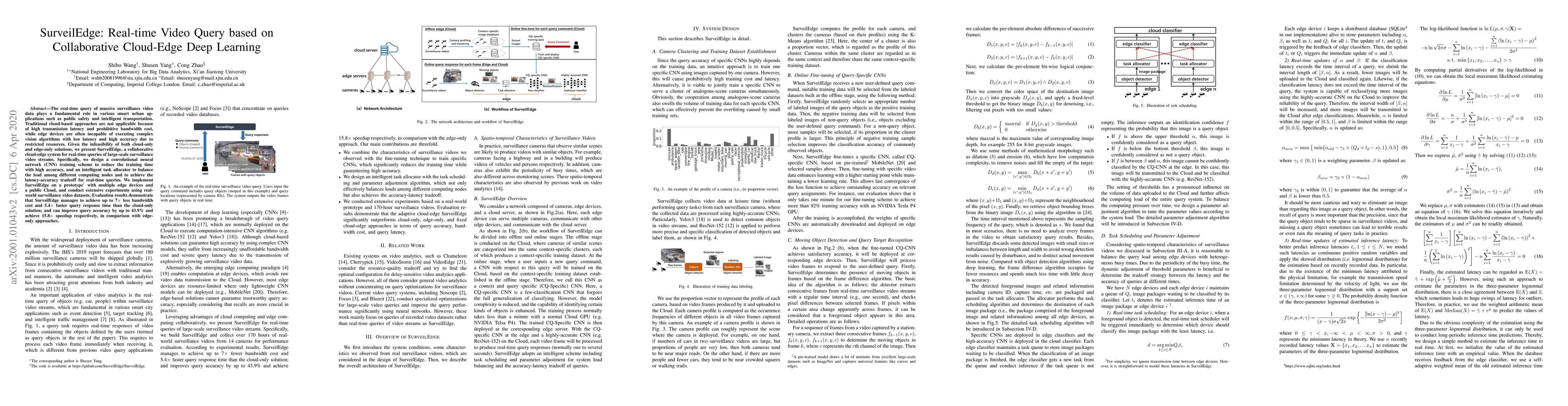 SurveilEdge is a collaborative cloud-edge system designed to efficiently handle real-time queries of large-scale surveillance video streams, addressing the limitations of both cloud-only and edge-only solutions. It achieves significant reductions in bandwidth cost and query response time while improving accuracy and speed.