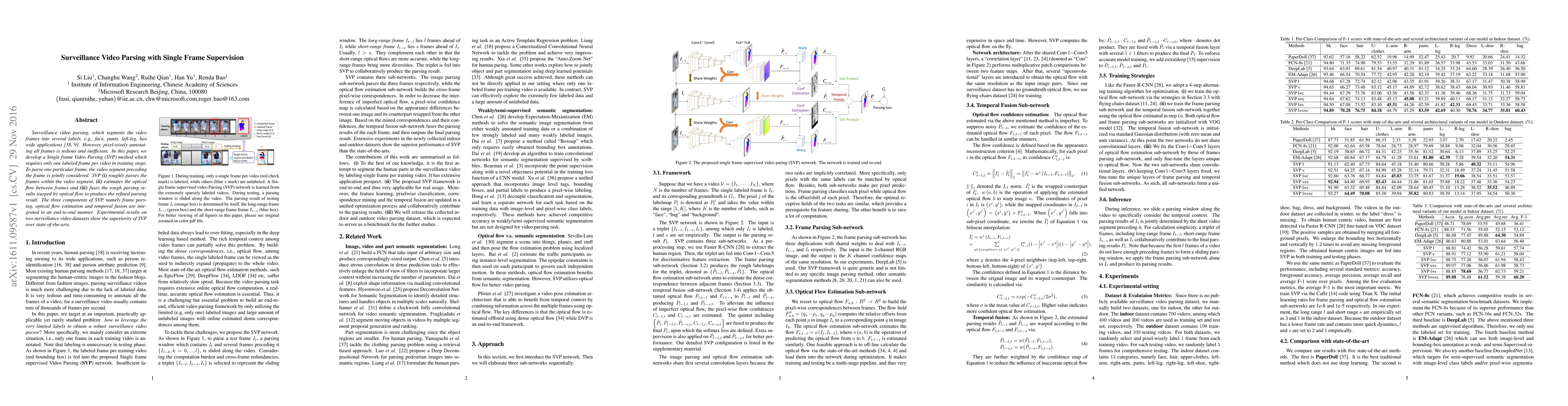 This paper introduces a Single Frame Video Parsing (SVP) method that segments video frames into labels with minimal supervision, requiring only one labeled frame per video. The SVP method integrates frame parsing, optical flow estimation, and temporal fusion in an end-to-end fashion to produce refined parsing results, demonstrating superior performance on surveillance video datasets.