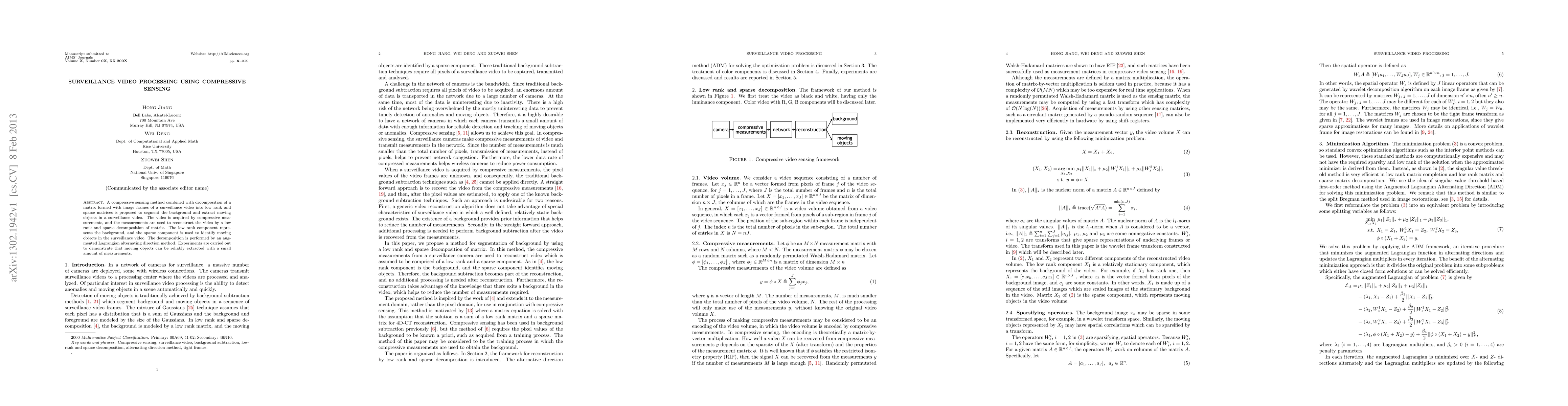 This paper proposes a compressive sensing method for processing surveillance videos by decomposing image frames into low-rank and sparse matrices to segment background and extract moving objects. The method uses an augmented Lagrangian alternating direction method for decomposition, demonstrating reliable extraction of moving objects with minimal measurements.