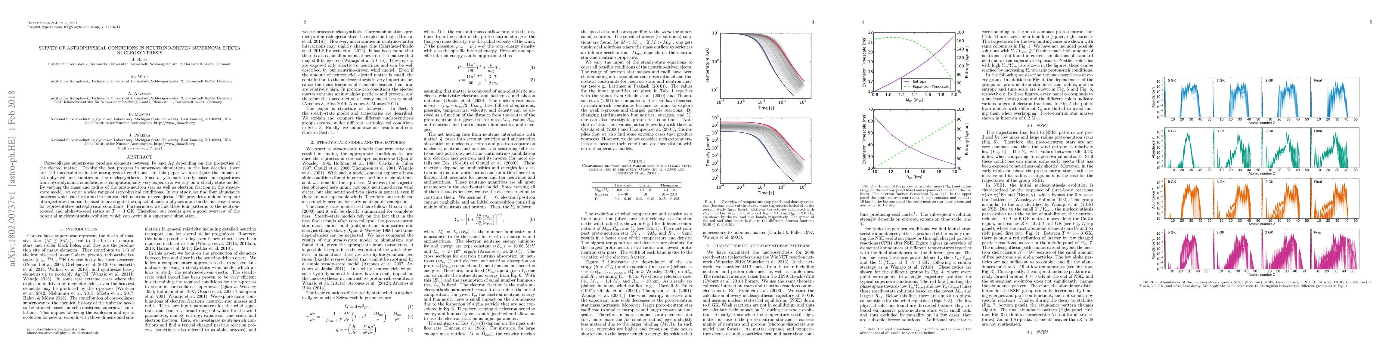 Core-collapse supernovae produce elements between Fe and Ag depending on the properties of the ejected matter. Despite the fast progress in supernova simulations in the last decades, there are still uncertainties in the astrophysical conditions. In this paper we investigate the impact of astrophysical uncertainties on the nucleosynthesis. Since a systematic study based on trajectories from hydrodynamic simulations is computationally very expensive, we rely on a steady-state model. By varying the mass and radius of the proto-neutron star as well as electron fraction in the steady-state model, we cover a wide range of astrophysical conditions. In our study, we find four abundance patterns which can be formed in neutron-rich neutrino-driven ejecta. This provides a unique template of trajectories that can be used to investigate the impact of nuclear physics input on the nucleosynthesis for representative astrophysical conditions. Furthermore, we link these four patterns to the neutron-to-seed and alpha-to-seed ratios at $T=3$~GK. Therefore, our results give a good overview of the potential nucleosynthesis evolution which can occur in a supernova simulation.