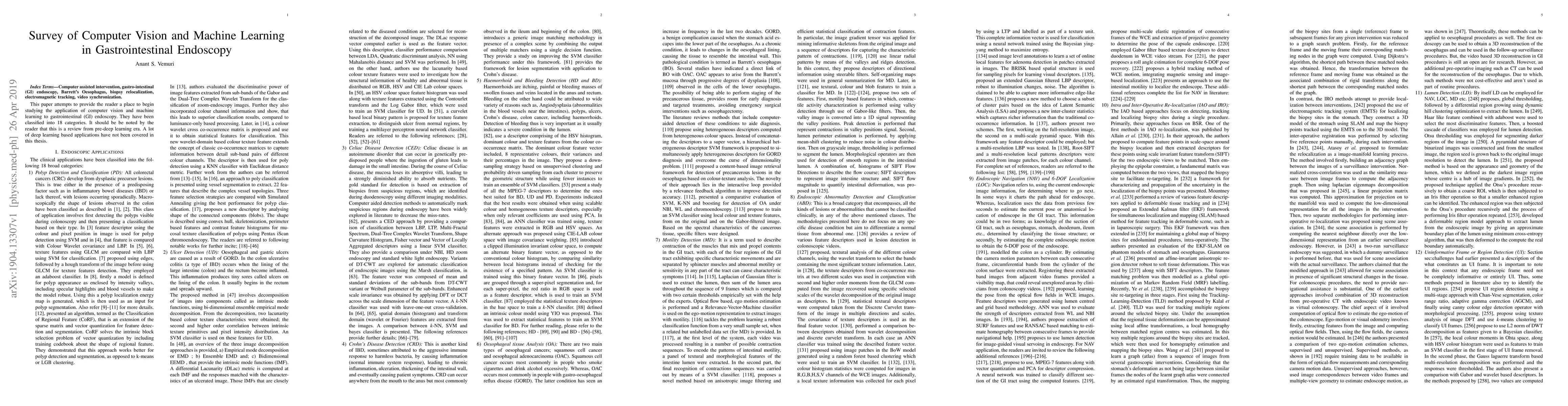 This paper attempts to provide the reader a place to begin studying the application of computer vision and machine learning to gastrointestinal (GI) endoscopy. They have been classified into 18 categories. It should be be noted by the reader that this is a review from pre-deep learning era. A lot of deep learning based applications have not been covered in this thesis.